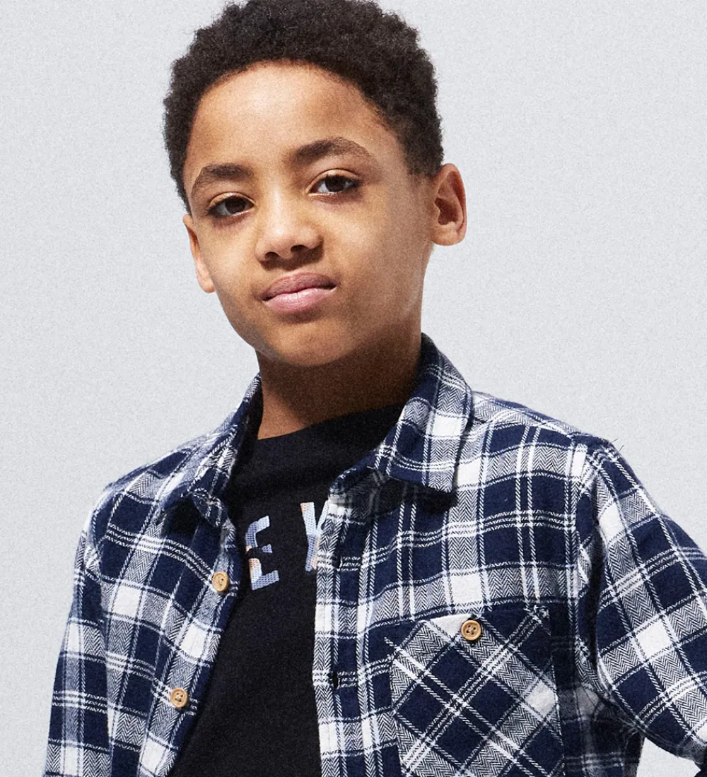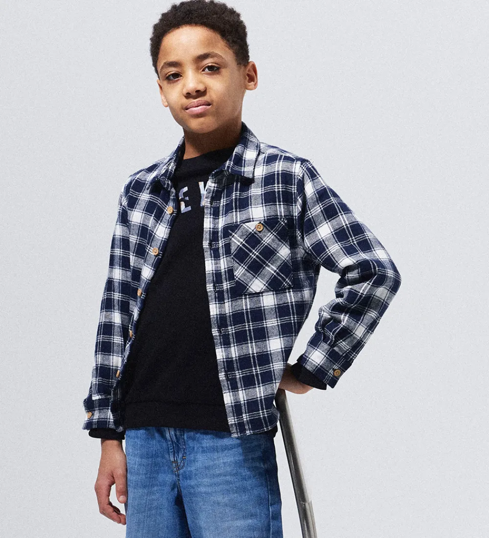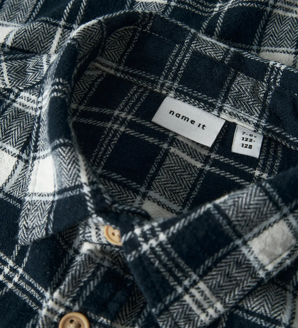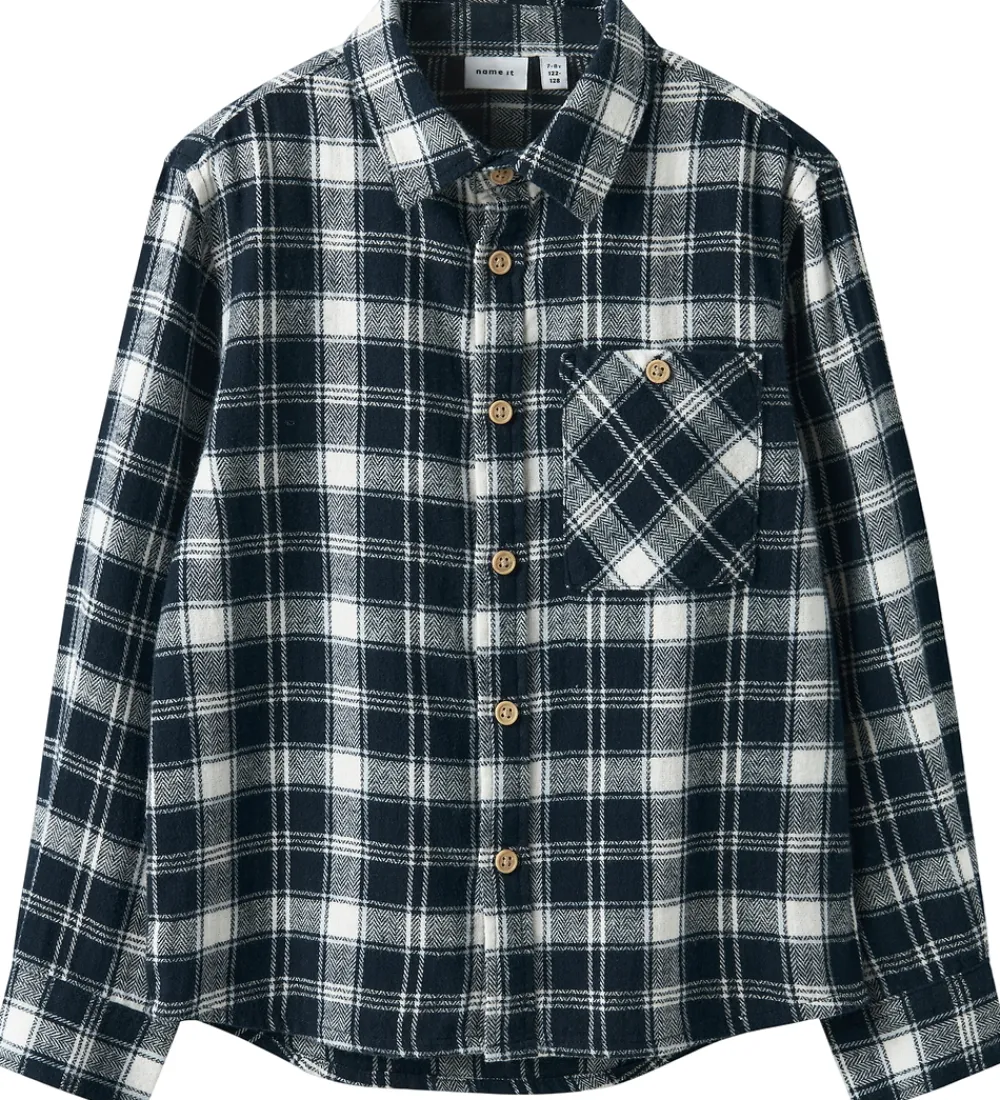 Stilfuld Name It skjorte i et klassisk ternet design i navyblå og hvid. Skjorten har en traditionel krave og gennemgående, brune knapper foran. Den har en brystlomme i venstre side og lange ærmer med manchetknapper.