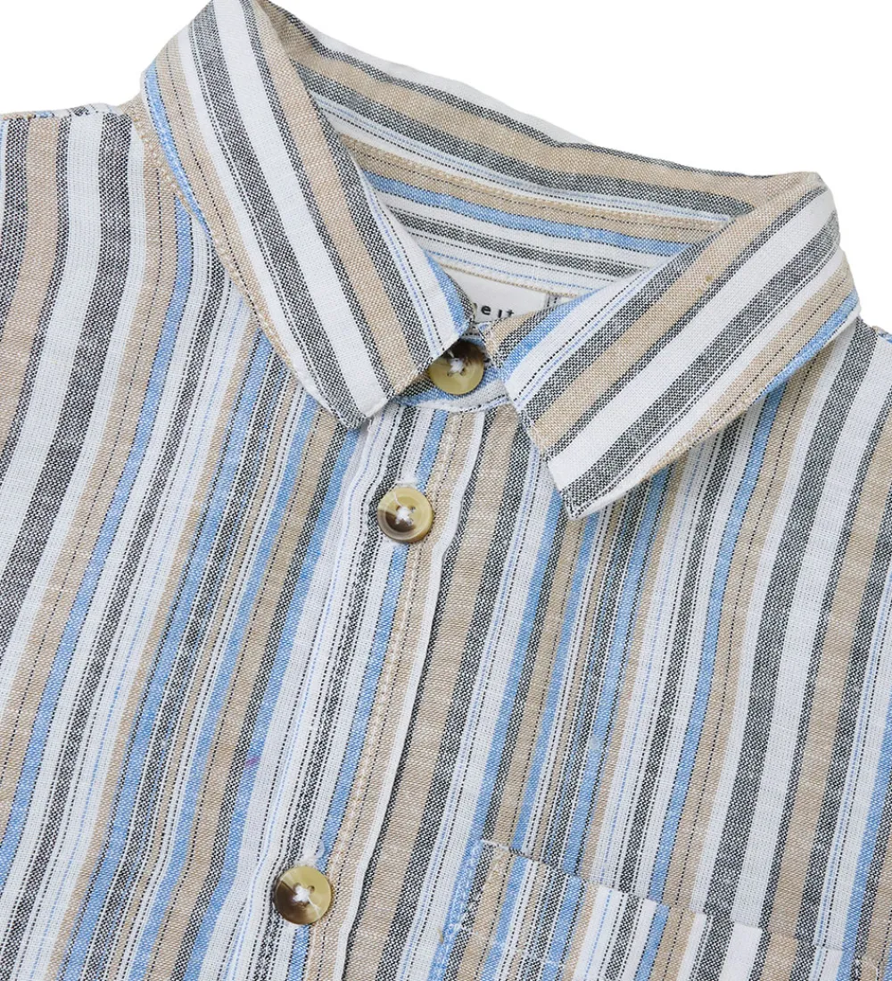 Smuk Name It skjorte med lange ærmer i en klassisk blå, grå, hvid og beige stribemønster. Skjorten har en praktisk brystlomme og knaplukning foran, hvilket gør den både stilfuld og funktionel.