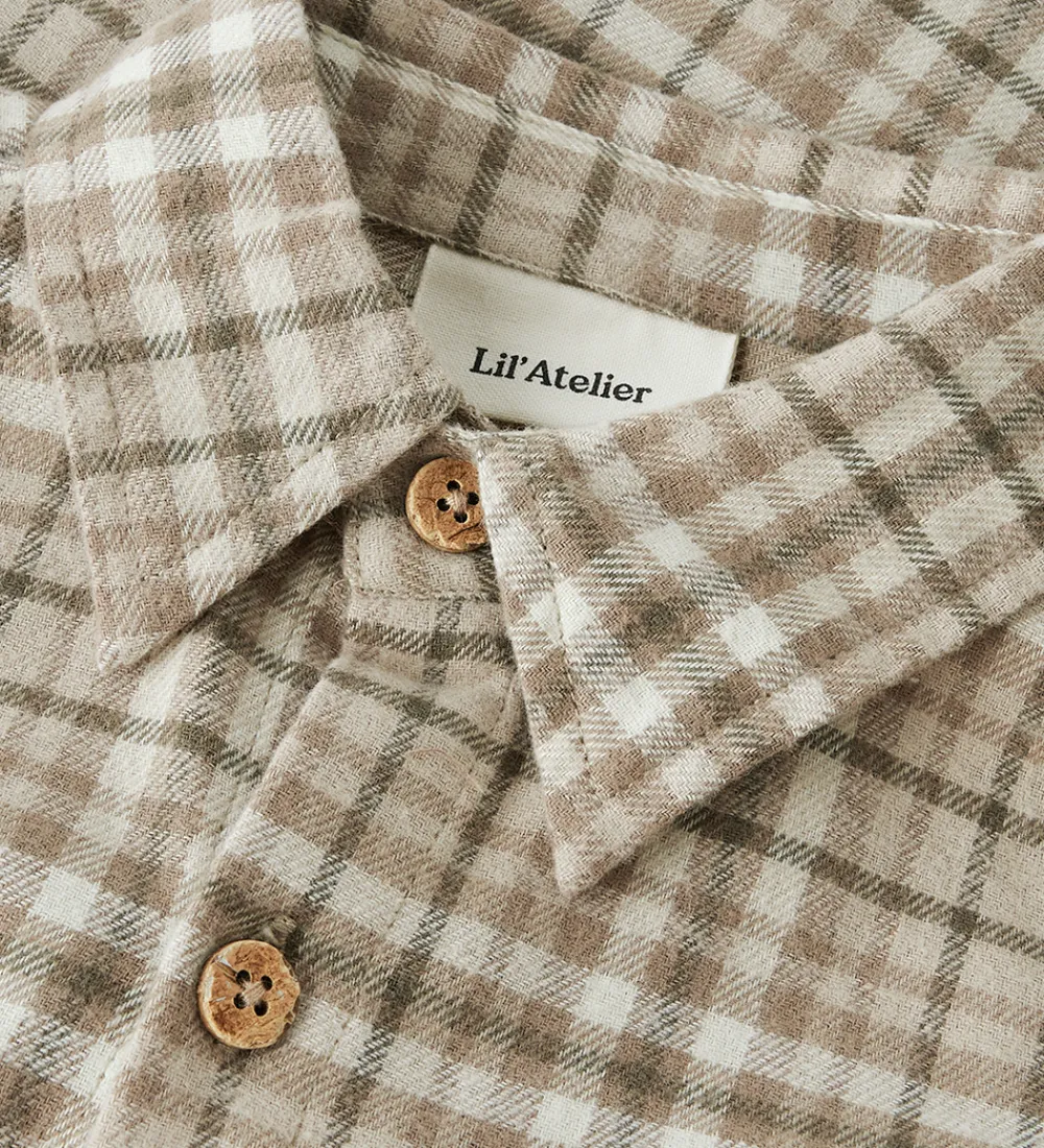 Fin Lil Atelier skjorte med et ternet mønster i beige og brune nuancer. Skjorten er fremstillet i dejlig blød flannel og er med en klassisk, ombukket krave og åben brystlomme. Ærrmerne afsluttes med en slids og knaplukning.
