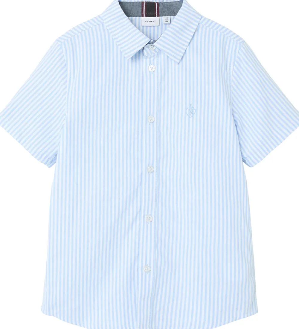 Flot Name It skjorte med korte ærmer i en lys blå farve med fine striber. Skjorten har en klassisk krave og knaplukning, samt en lille logopatch på brystet.