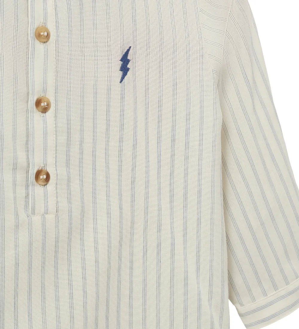Elegant Sofie Schnoor skjorte i råhvid med striber i blå. Skjorten har lange ærmer og et fint lynmotiv på brystet, hvilket giver et stilfuldt og tidløst look.
