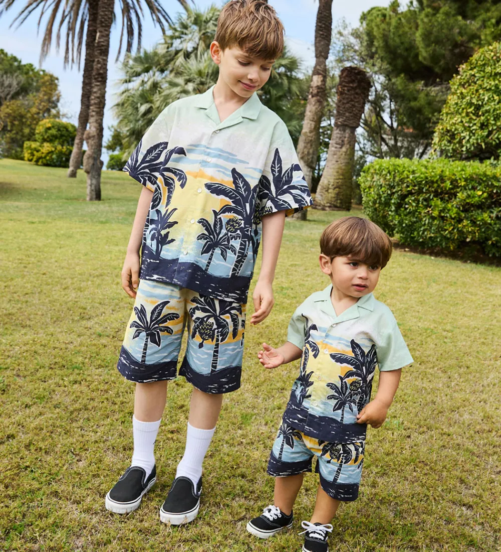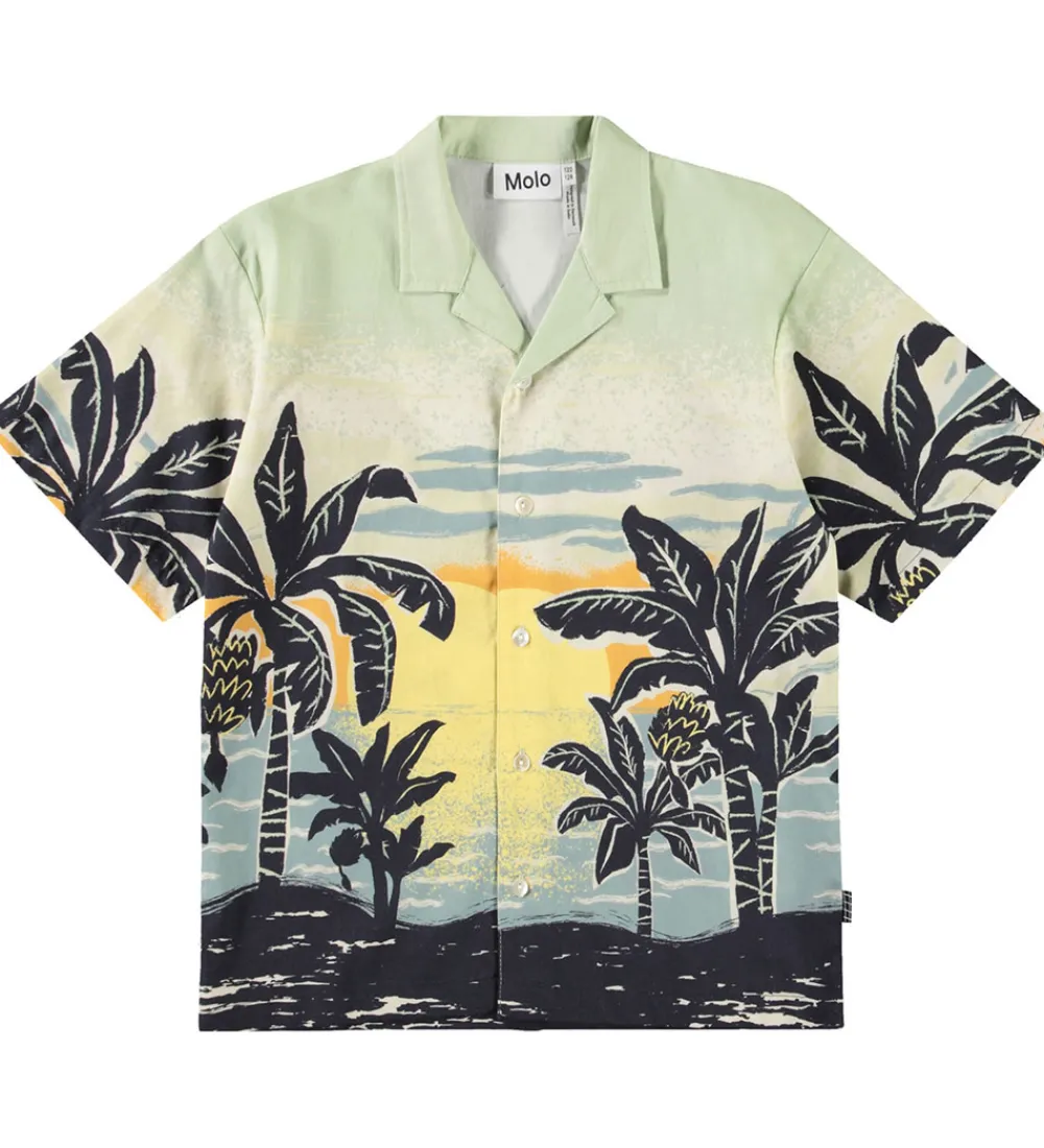 Skøn Molo skjorte med korte ærmer i en lys grøn nuance og med et stemningsfyldt palmeprint.
