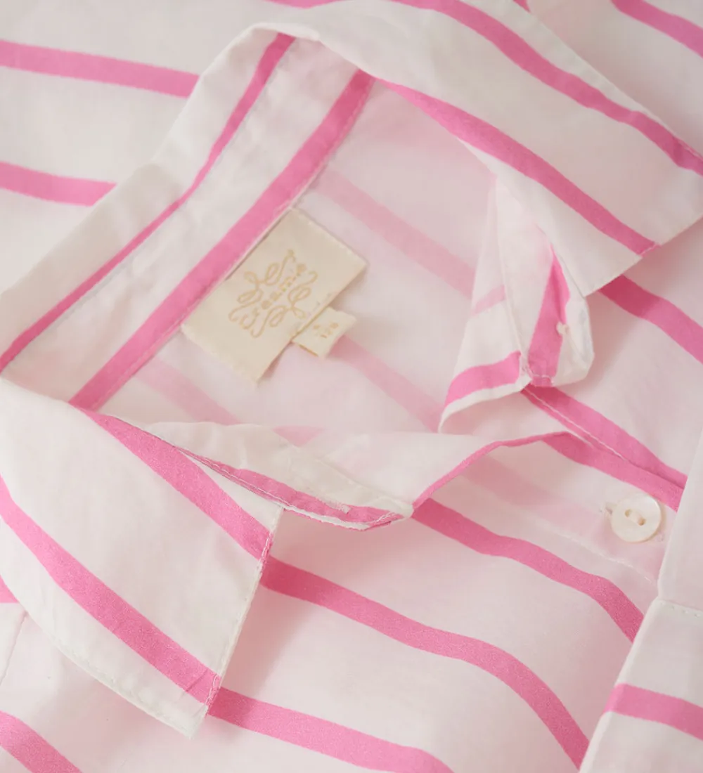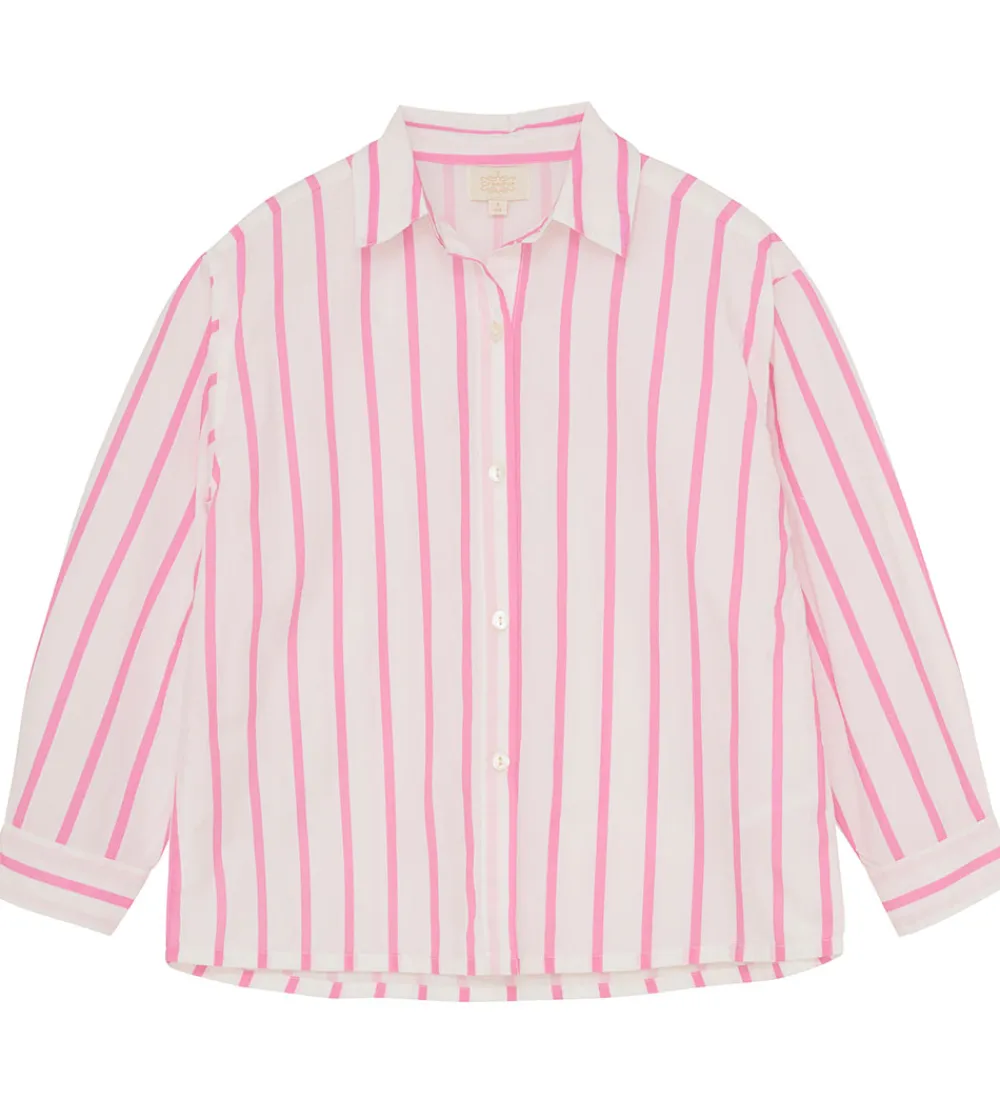 Flot Creamie skjorte i hvid med lodrette striber i pink. Skjorten har en klassisk skjortekrave og gennemgående perlemorsknapper fortil. Den har en løs pasform med lange ærmer.