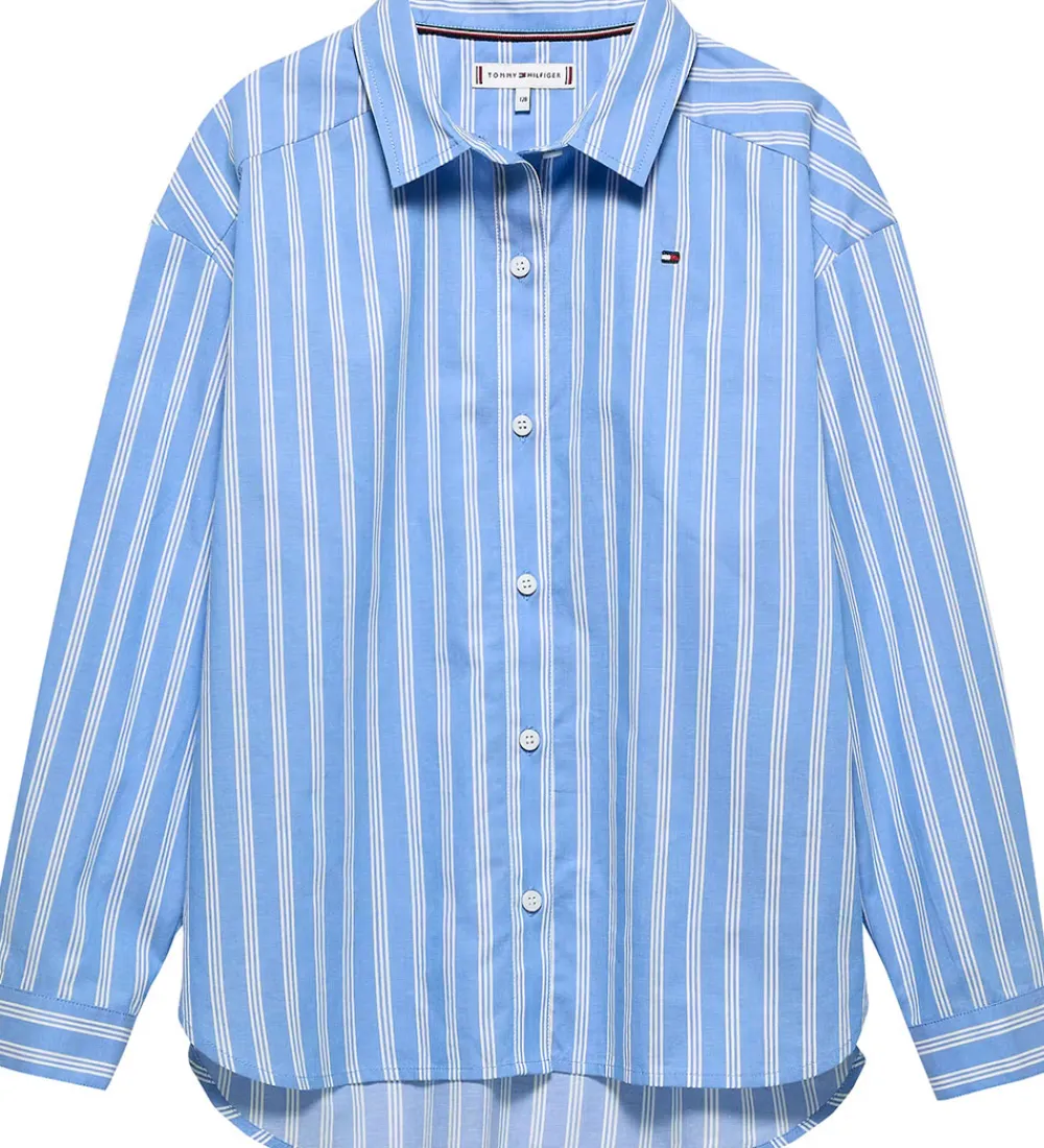 Stilfuld Tommy Hilfiger skjorte med et klassisk stribet mønster i lyseblå og hvide nuancer. Den har lange ærmer og en traditionel krave. Skjorten fra Tommy Hilfiger har knaplukning foran og et lille broderet logo på brystet.