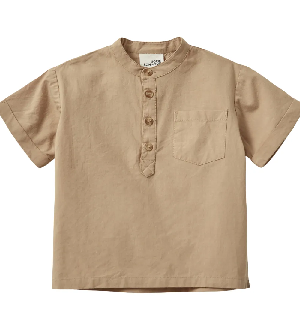 Elegant Sofie Schnoor skjorte med korte ærmer i en klassisk, lysebrun nuance. Skjorten har en stilfuld knaplukning og praktisk brystlomme, der tilføjer et rent udtryk til ethvert outfit.