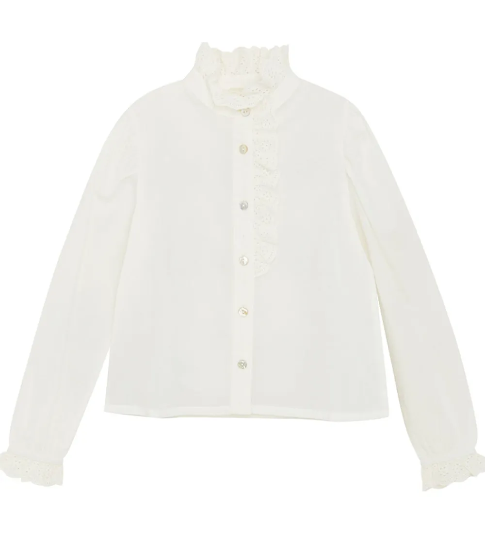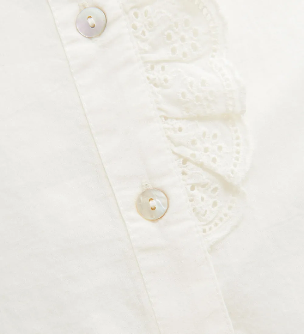 Skjorten har en elegant høj krave med flæsede, broderie anglaise kanter, der findes både langs knapstolpen og ved ærmerne. Knapperne er fint placeret i midten, hvilket giver et stilrent look.