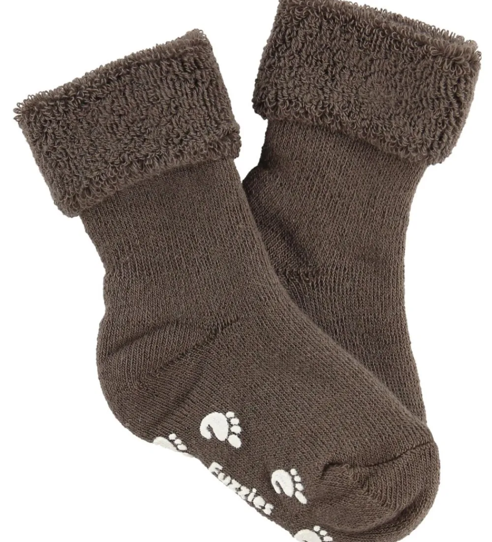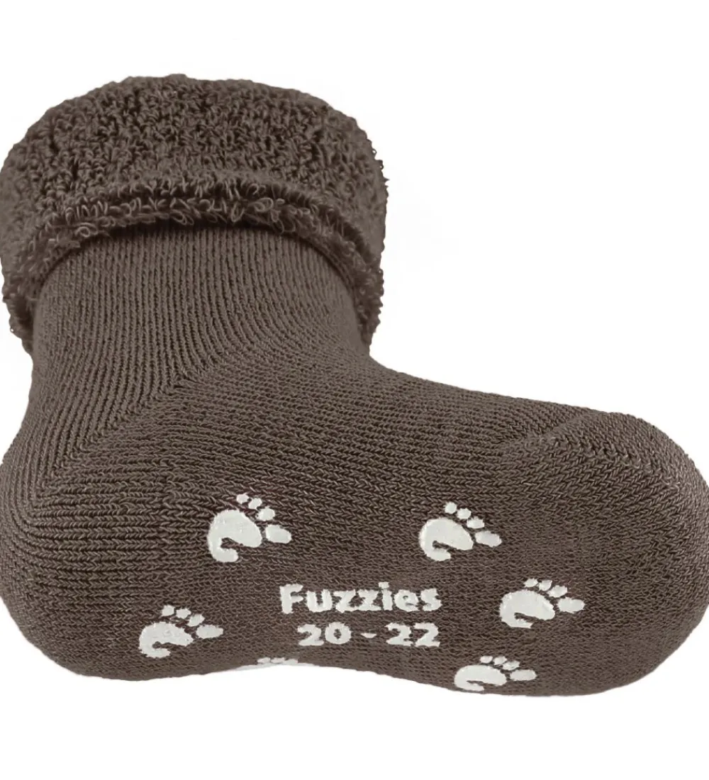 Seje Fuzzies-gåstrømper i valnøddebrun med hvide logoer bestående af sjove fodaftryk samt navnet “Fuzzies” under foden, der er lavet af et skridsikkert gummimateriale.