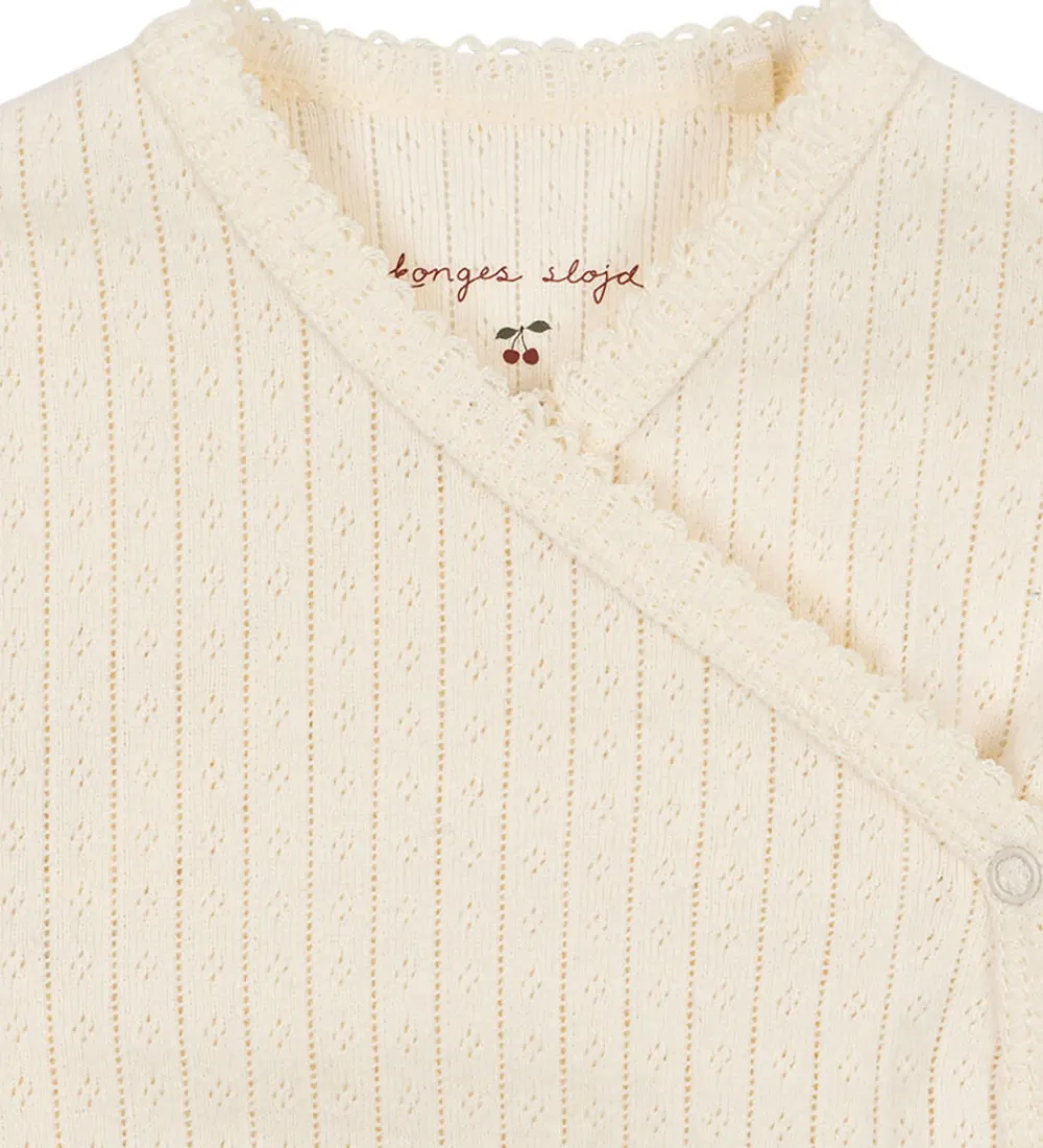 Fin Konges Sløjd body i ensfarvet hvid med et flot hulmønster. Bodyen har et praktisk slå om-design, hvor den lukkes med trykknapper bed ad venstre side. Bodyen lukke benene med tre trykknapper.