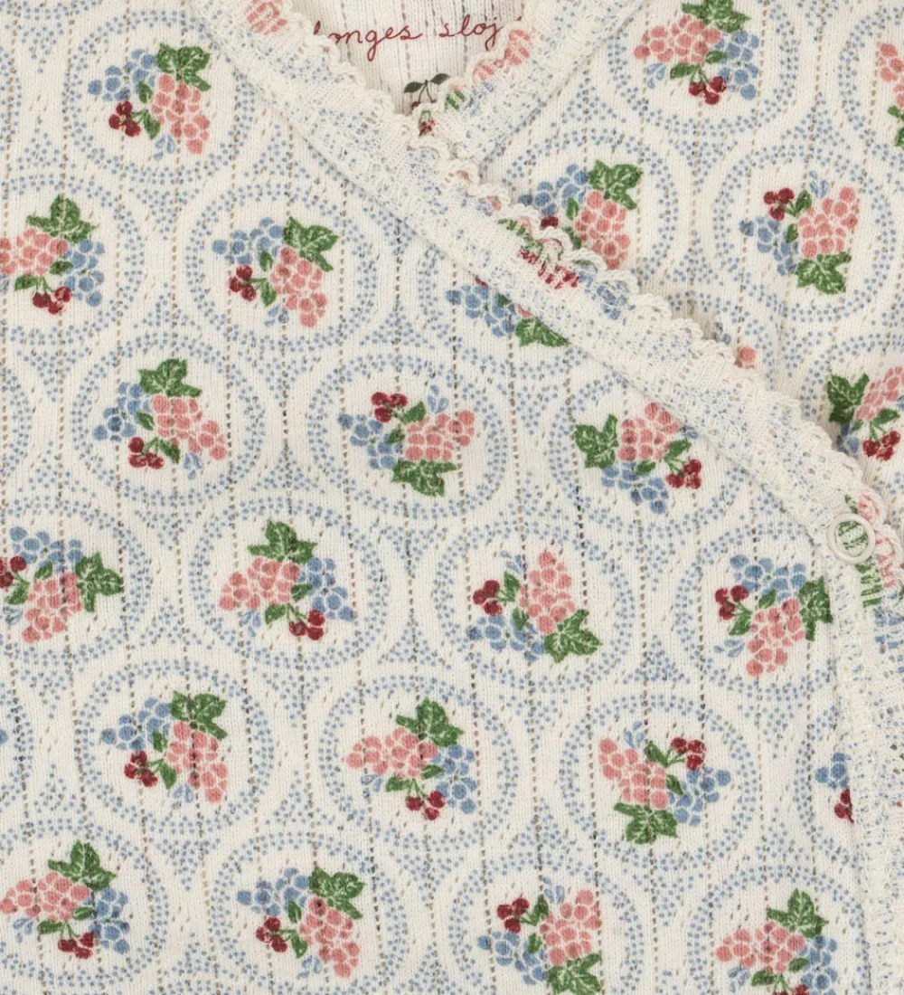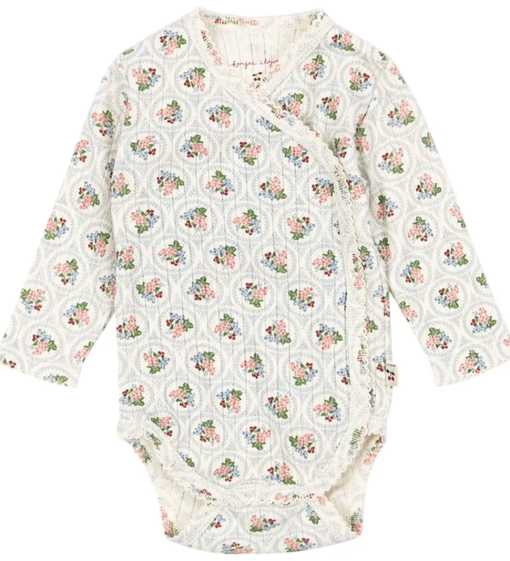 Charmerende Konges Sløjd slå-om body i hvid med et smukt blomstermønster i blå og rosa nuancer. Slå-om bodyen har et diskret hulmønster samt lange ærmer.