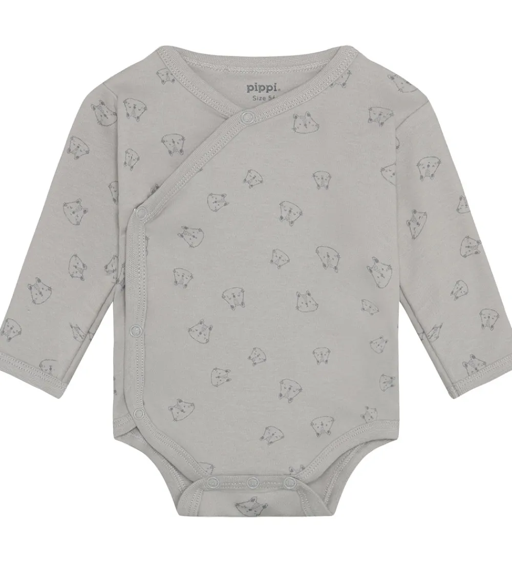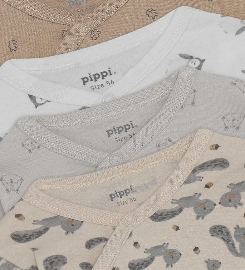 Pippi Baby bodyerne har lange ærmer med smalle ribkanter omkring alle åbninger. Bodyerne har et praktisk slå-om design med trykknapper ned langs begge sider. I bunden lukkes bodyen med tre praktiske trykknapper.