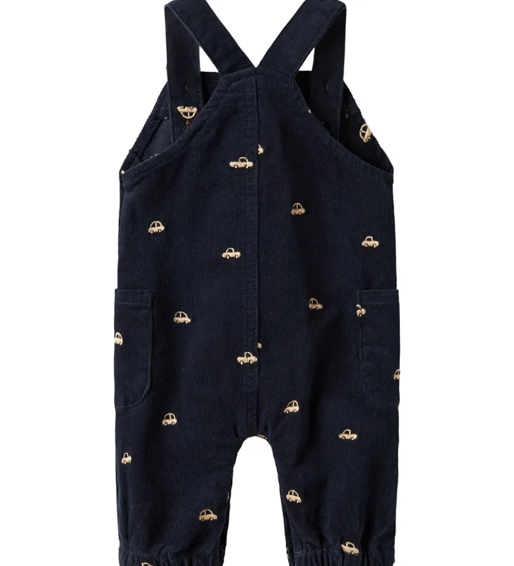 Skønne Name It smækbukser i navyblåt fløjlsvelour med broderede biler i beige.