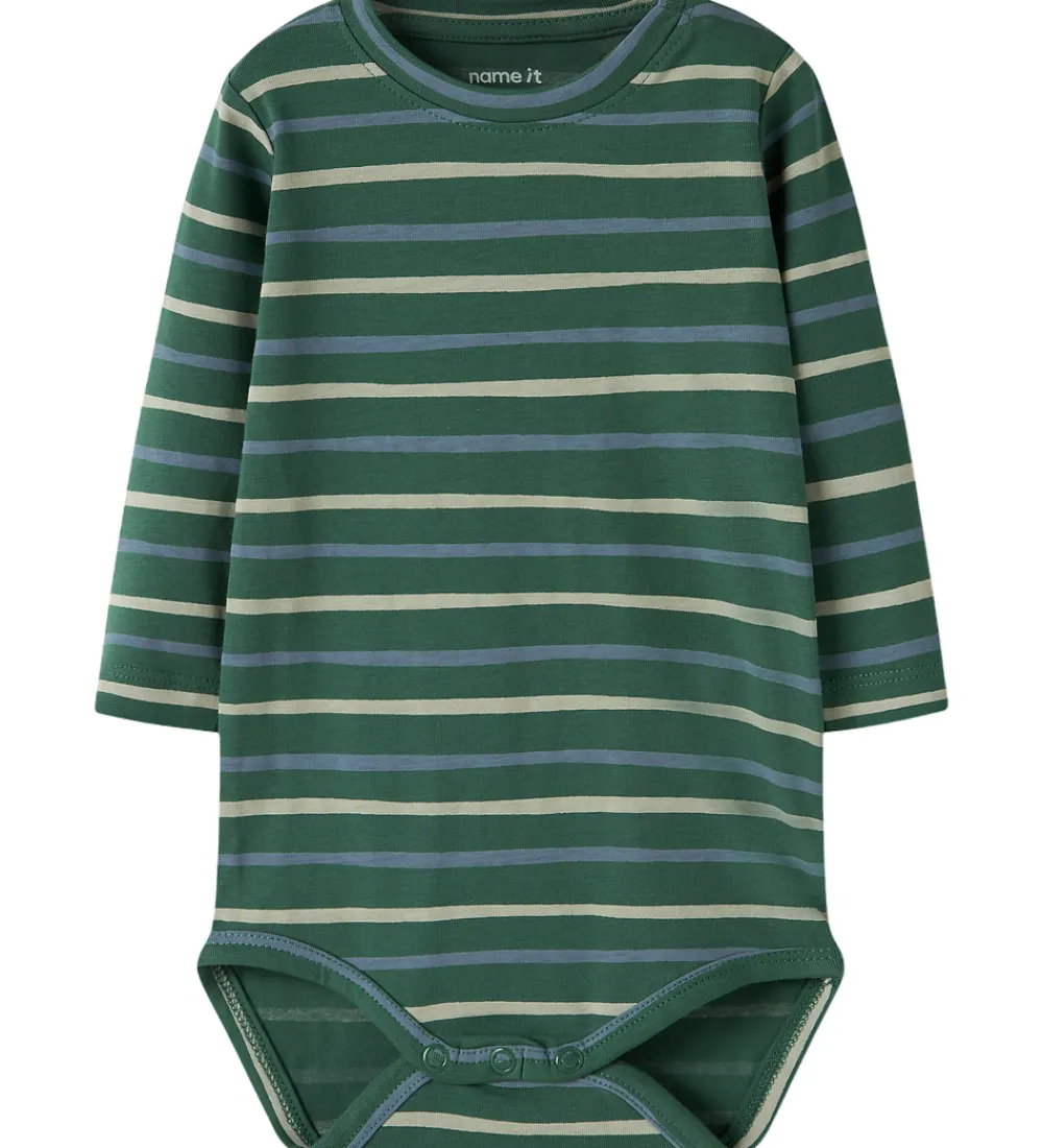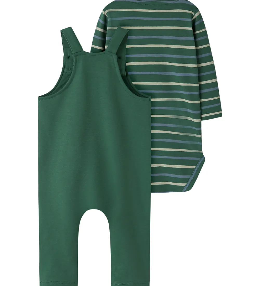 Sødt Name It sæt bestående af et par smækbukser i mørkegrøn med print af en dinosaur på brystet og en body med lange ærmer i mørkegrøn med striber i beige og blå.