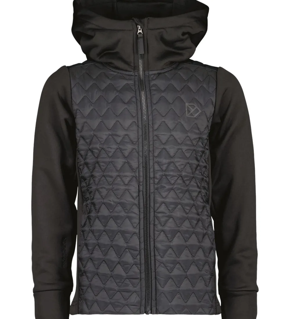 Lækker Didriksons softshelljakke i sort. Kroppen er i et glatvævet materiale med en bølgende, quiltet struktur, mens resten er i softshell.