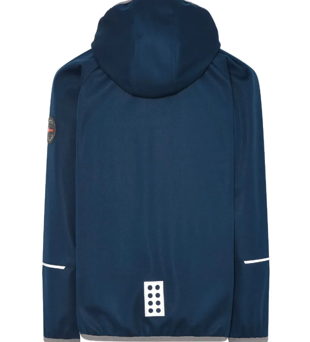 Fin LEGO® Wear softshelljakke i navy med grå lynlåse og koksgrå kanter. Softshelljakken har reflekser formet som LEGO® klodser på bryst og nederst på ryggen.