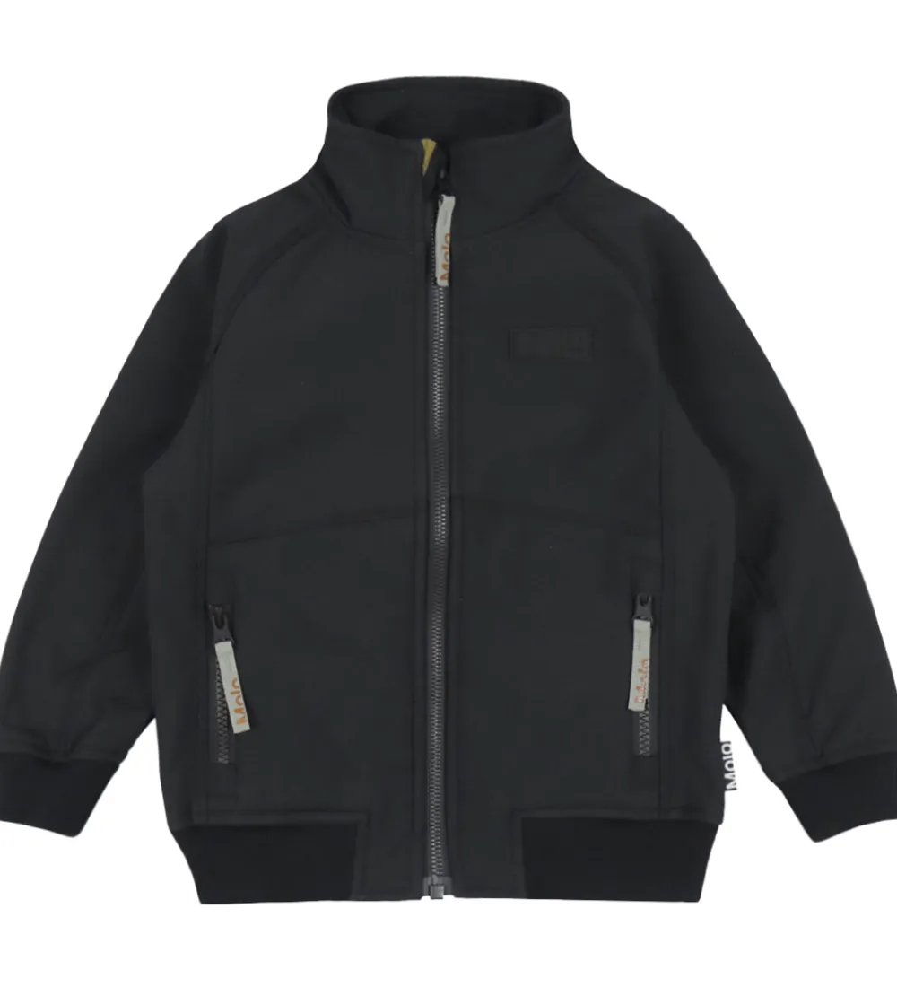 Molo softshelljakken har brede ribkanter, og den åbnes med en lynlås med hagebeskytter og indvendig vindstolpe. I siderne er der praktiske, fleeceforede lommer, som lukkes med en lynlås. Softshelljakken er foret med blødt fleece i brun. Nederst på ryggen er der et praktisk refleksprint.