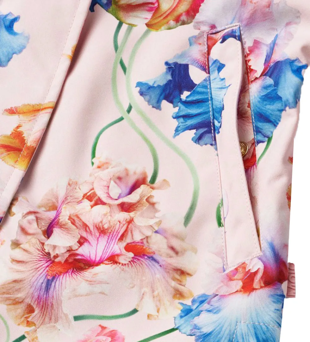 Skøn Molo softshelljakke i rosa med et alloverprint af store farverige blomster. Bagpå er der en stor refleks i højre side.