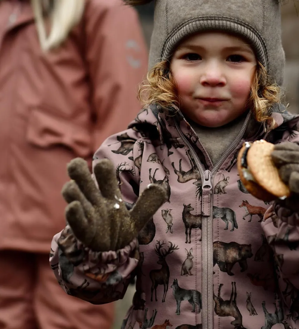Fed Mikk-Line softshelljakke i mørk, støvet rosa med et med et alloverprint af nordiske skovdyr i afdæmpede nuancer.