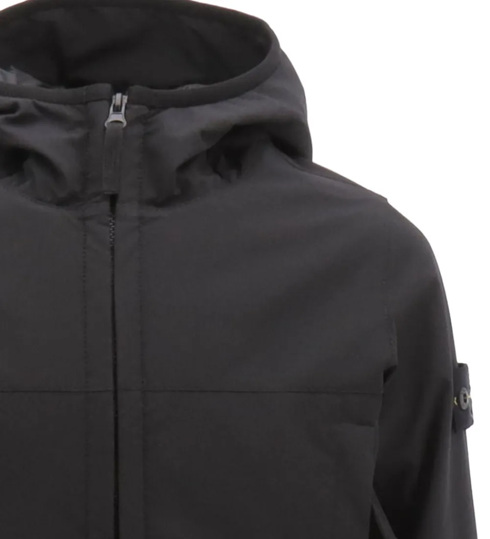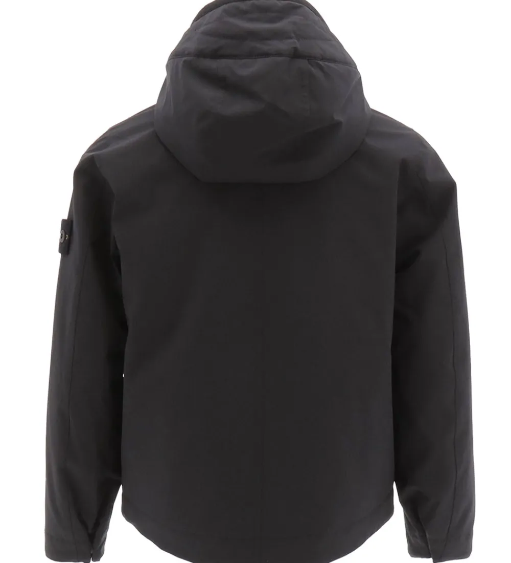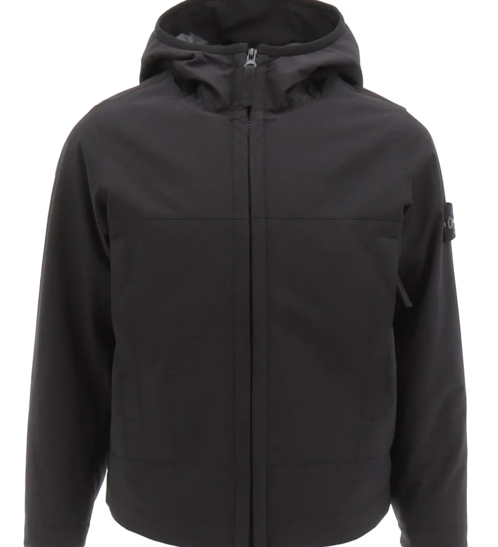 Lækker Stone Island softshelljakke i ensfarvet sort, og øverst på venstre ærme sidder det ikoniske logomærke fast med knapper.