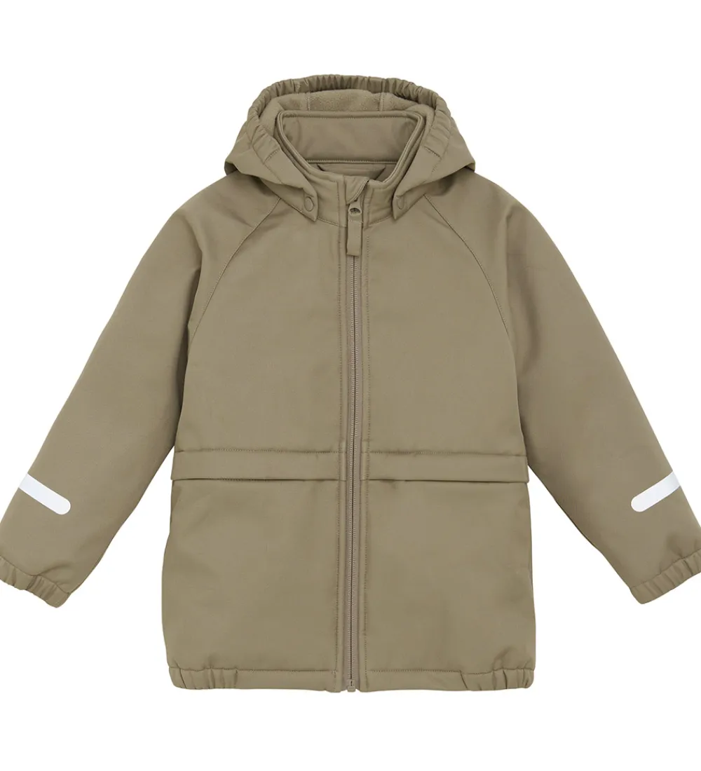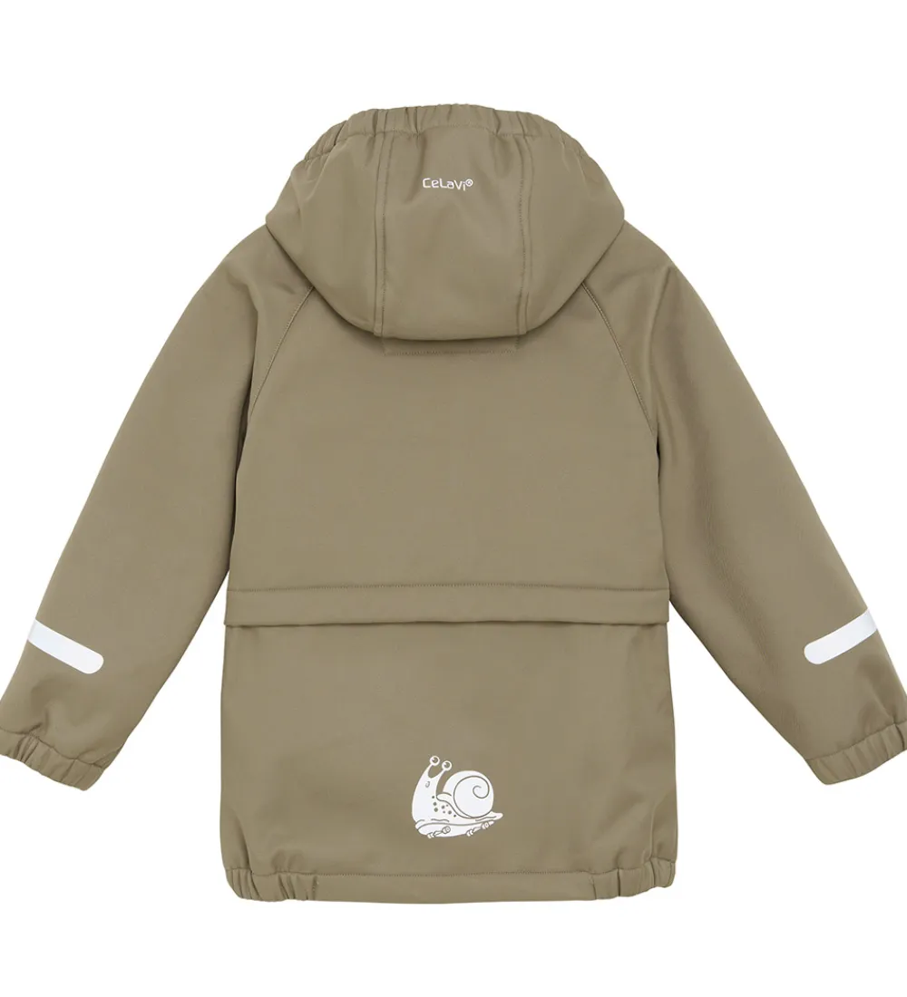 CeLaVi softshelljakken har en aftagelig hætte, som sidder fast med trykknapper, og den har smalle elastikkanter.