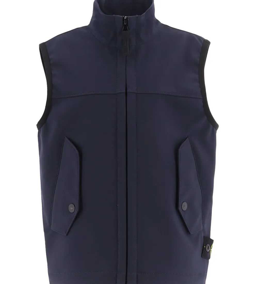 Lækker Stone Island softshellvest i ensfarvet navy, og nederst i venstre side sidder det ikoniske logomærke fast med knapper.