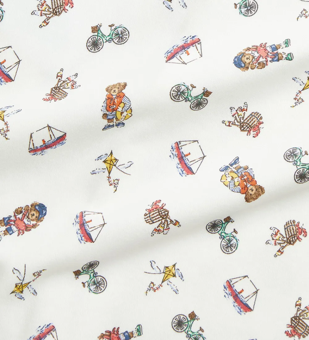 Lækker Polo Ralph Lauren sommerdragt i hvid med et alloverprint i brune nuancer med cykler, skibe og bamser med redningsvest på.