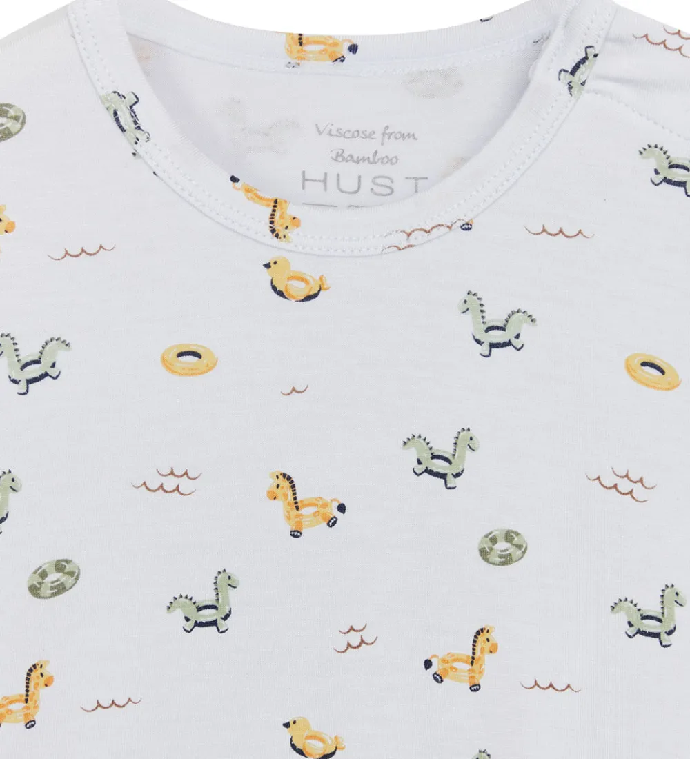 Sjov Hust and Claire sommerdragt i en lyseblå farve, prydet med sødt alloverprint af baderinge formet som heste, dinosaurer og ænder. Denne sommerdragt sikrer komfort og stil til de små, fra Hust and Claire.
