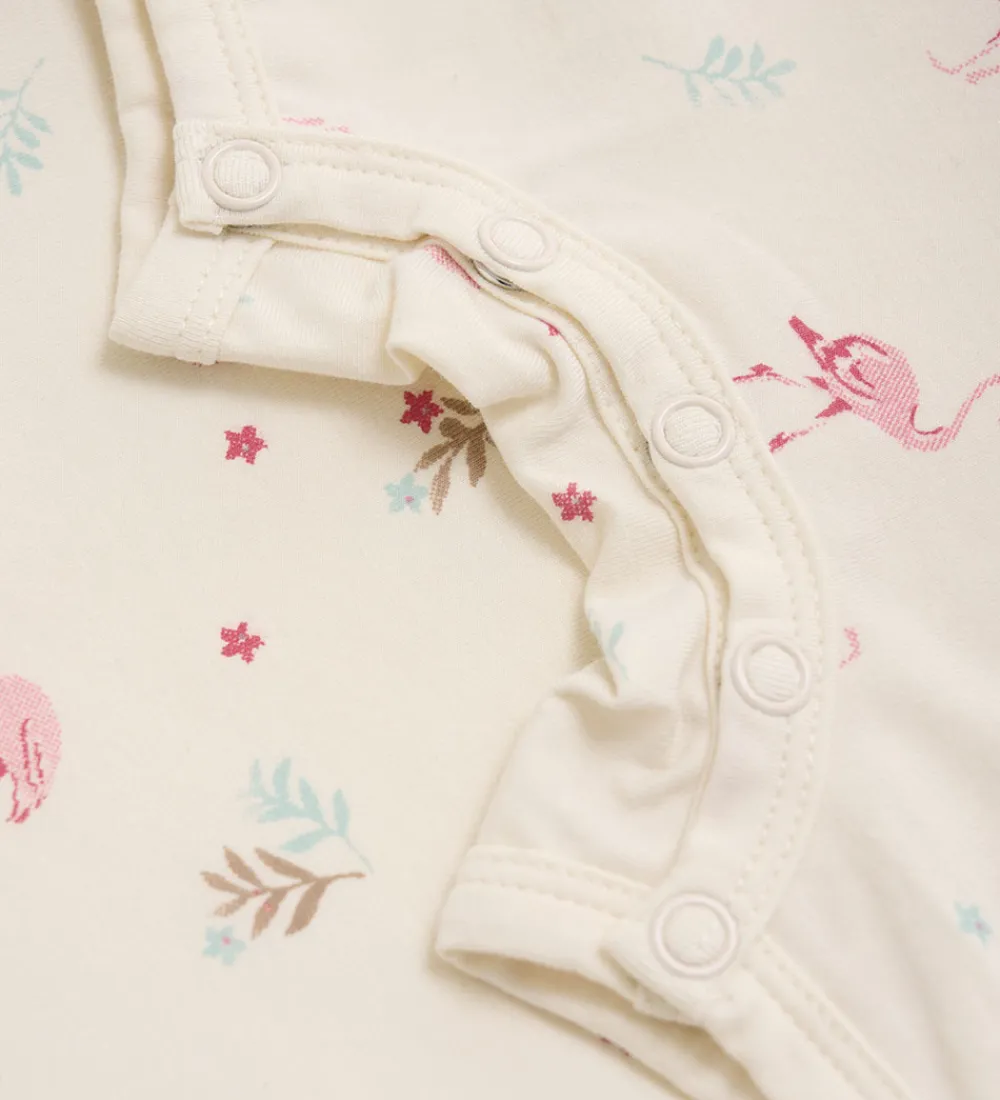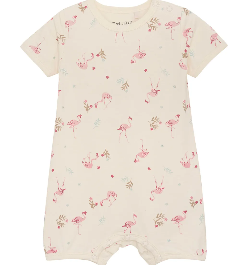 Sød CeLaVi sommerdragt i hvid, med et alloverprint af søde flamingoer og blade i rosa, brune og grønne nuancer.