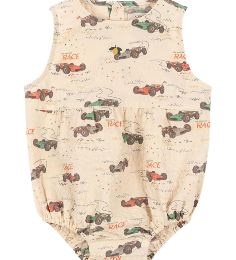 Skøn Konges Sløjd sommerdragt i en beige nuance, prydet med et farverigt alloverprint med racerbiler og tekst.