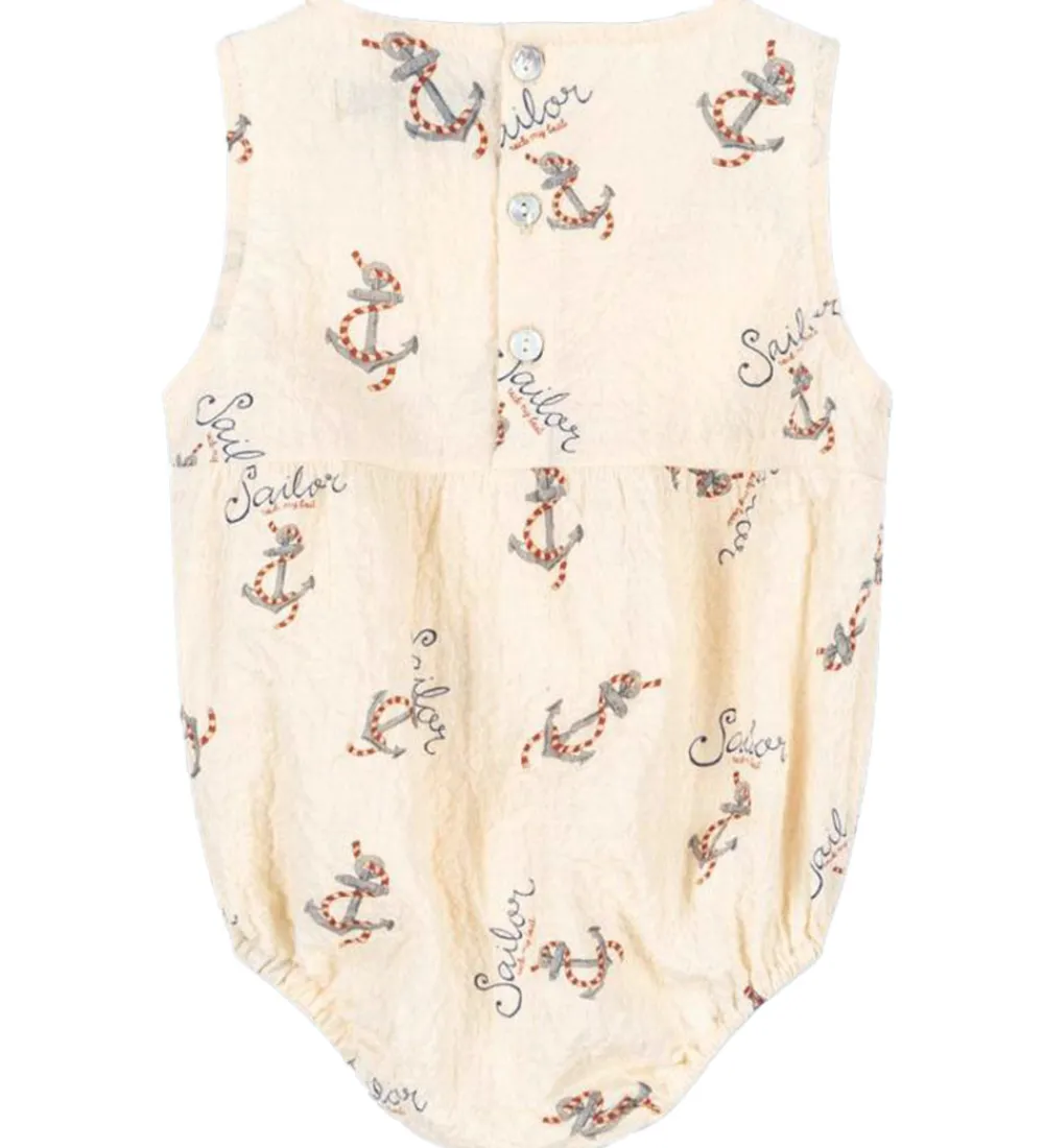 Fin Konges Sløjd sommerdragt uden ærmer i en råhvid farve med et iøjnefaldende anker- og tekstprint. Sommerdragen har en let pasform, der giver fri bevægelse til små eventyrere.