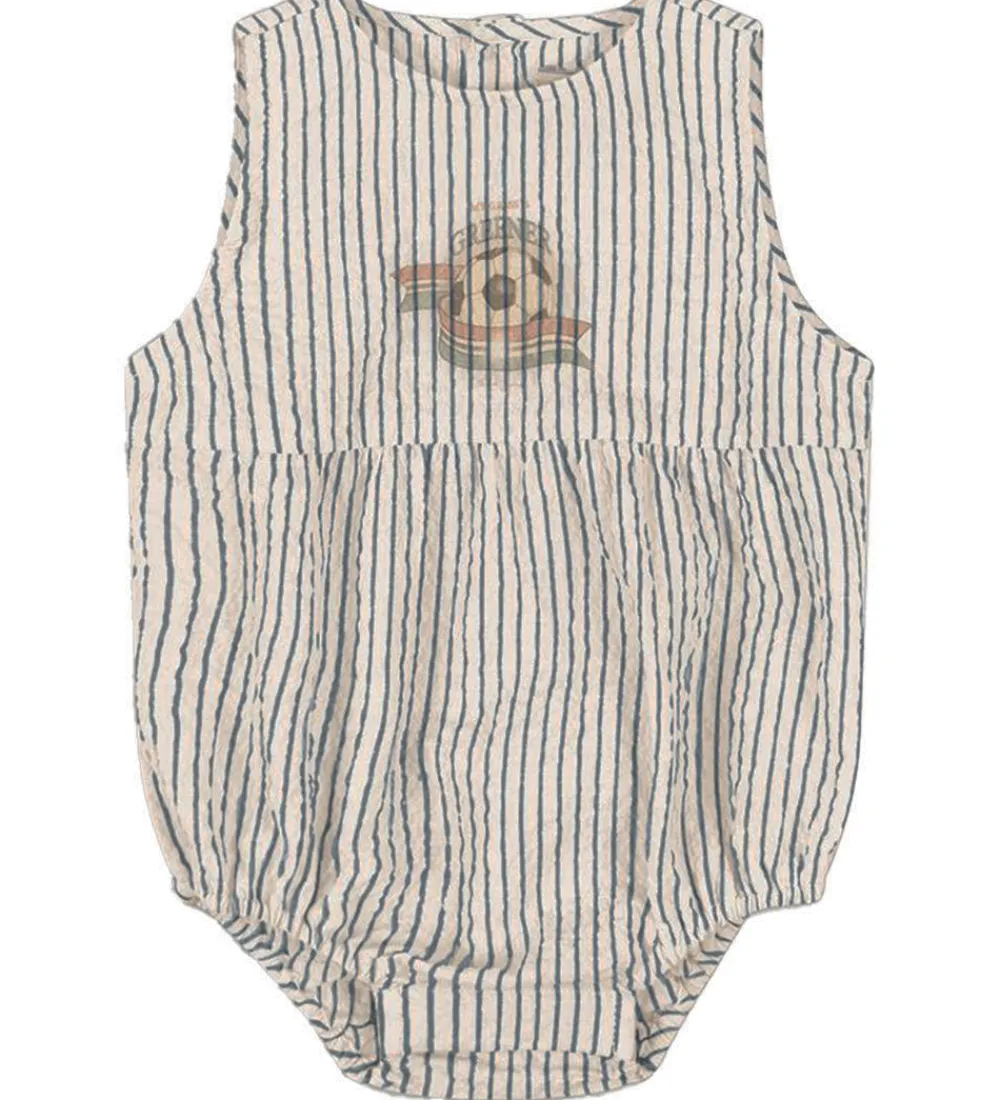 Charmerende body fra Konges Sløjd i en lys beige farve med fine blå striber. Bodyen har ingen ærmer og et sødt fodboldprint i på fronten.