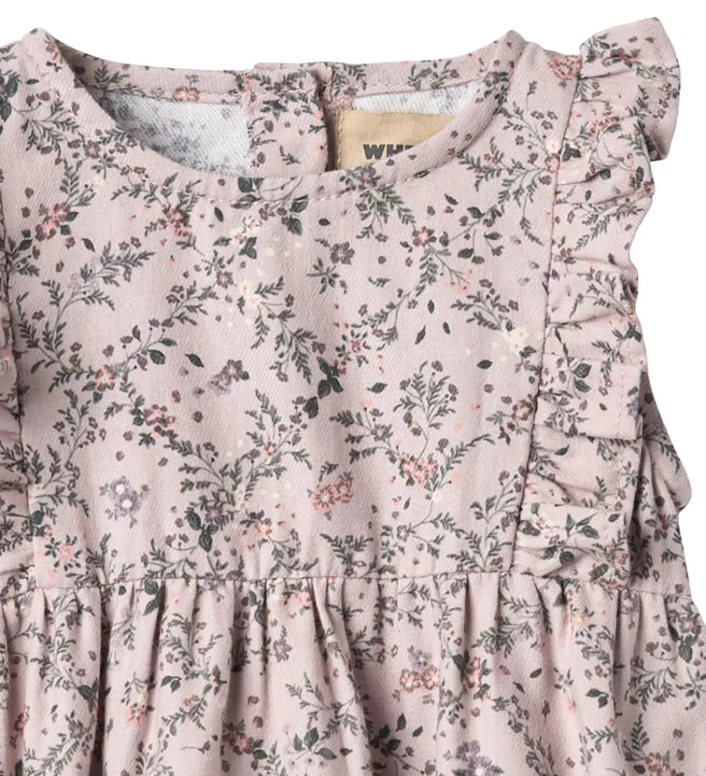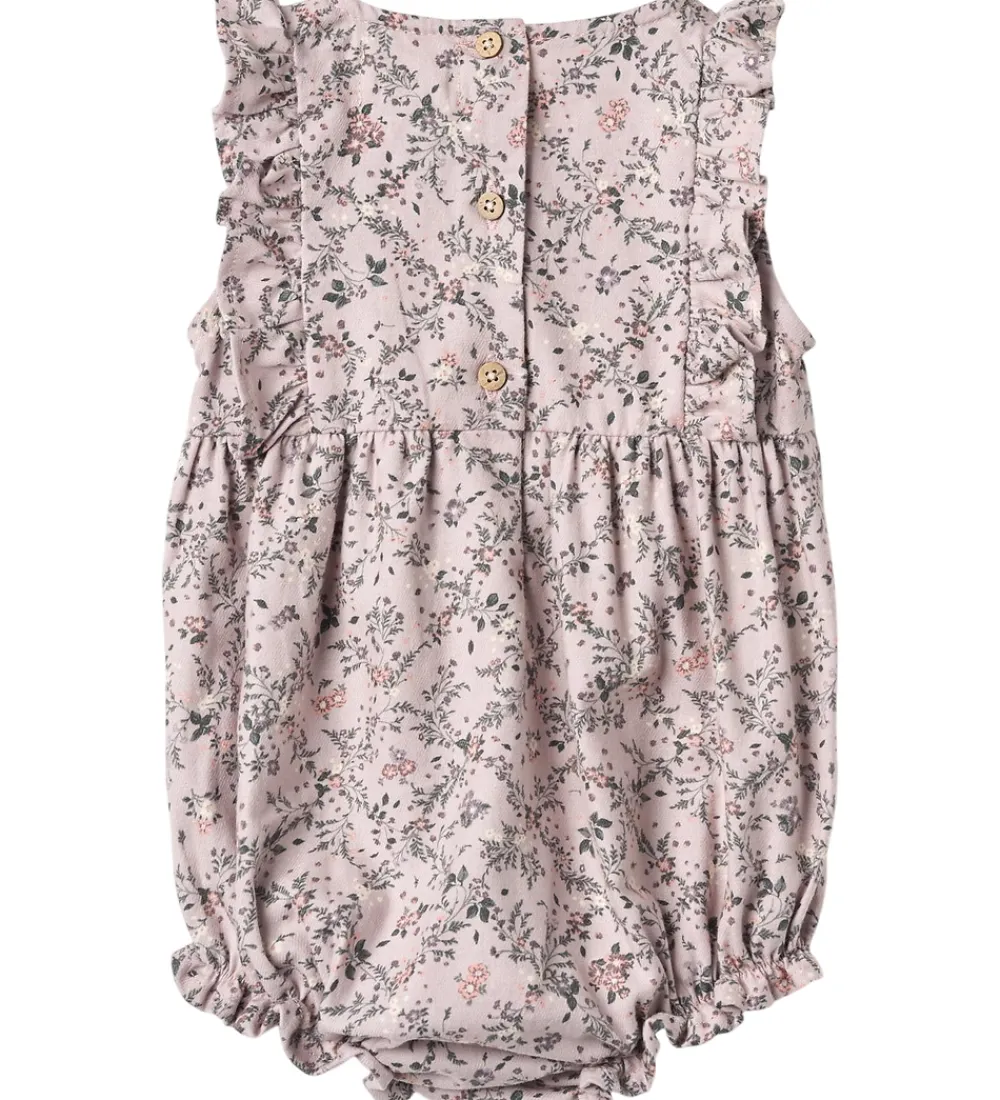 Elegant Wheat sommerdragt i en sart lilla med et fint blomsterprint. Sommerdragten er uden ærmer og ben, og over skuldrene har den flotte flæser. Den åbnes på ryggen med træknapper, samt mellem benene med praktiske trykknapper.