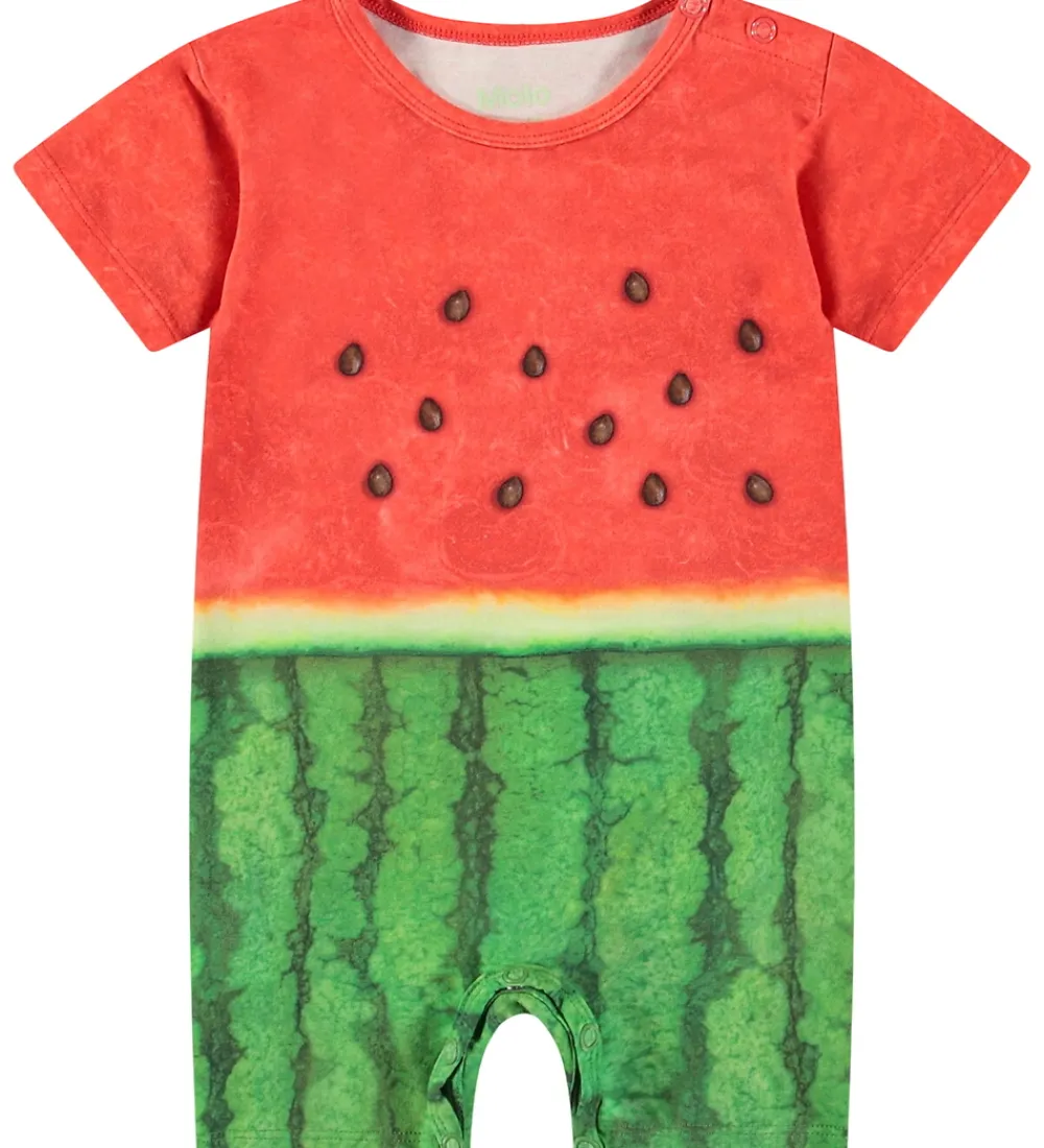 Livlig Molo sommerdragt med et print af en saftig vandmelon. Sommerdragten har korte ærmer og ben. Den åbnes ved den venstre skulder med trykknapper, og mellem benene kan den åbnes helt op med trykknapper.