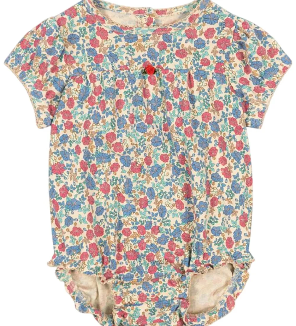 Farverig Konges Sløjd sommerdragt med et smukt blomsterprint i blå, rød og beige nuancer. Sommerdragten har korte ærmer og en rund halsudskæring, der fuldender et klassisk look. Trykknapper mellem benene gør påklædningen lettere.