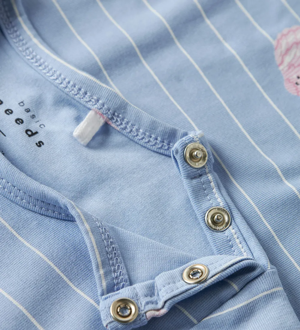 Skøn Name It sommerdragt i en lyseblå farve med smalle, hvide striber. Sommerdragten har et charmerende muslingeprint i lyserød nuancer, der giver et hyggeligt udtryk.