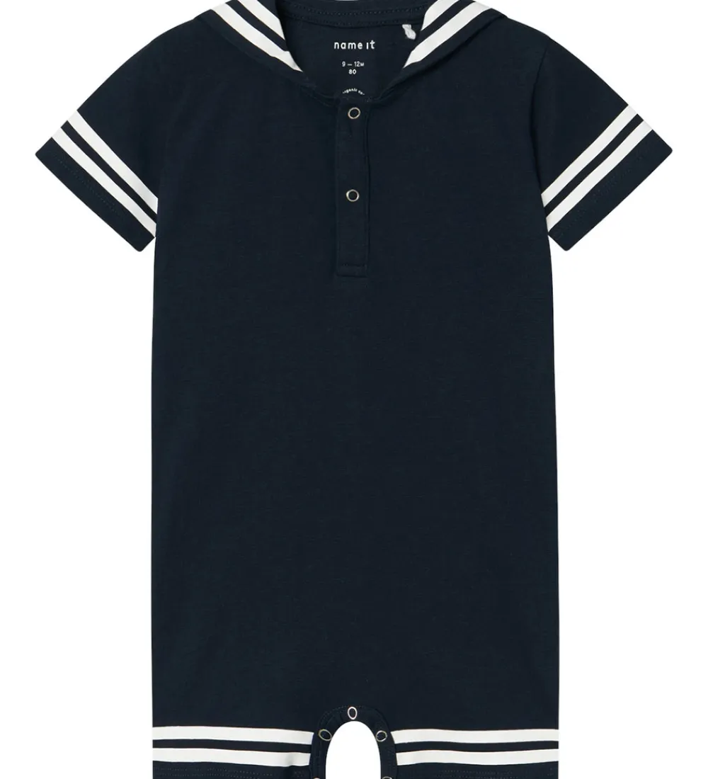 Skøn Name It sommerdragt i navy med to hvide striber rundt om benene, ærmerne og kraven.