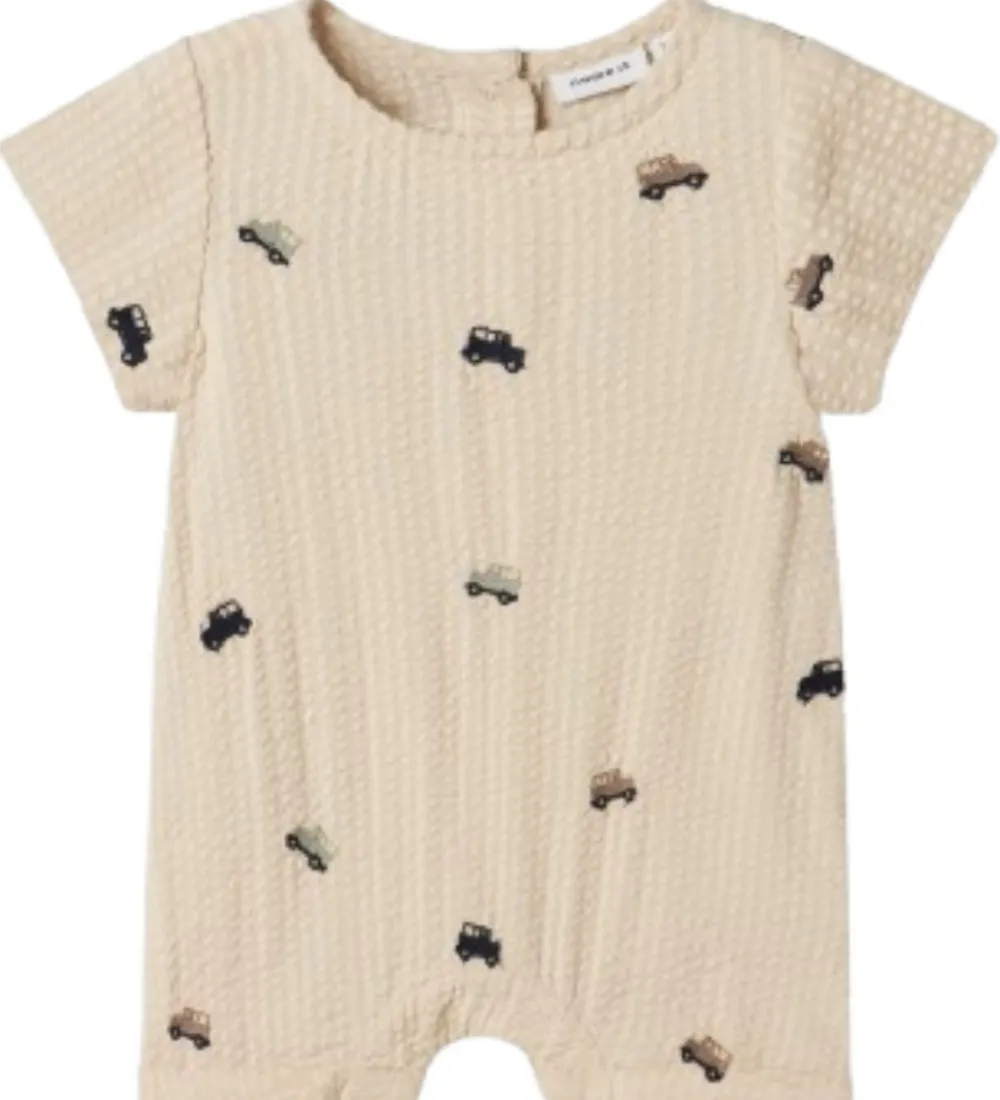 Dejlig Name It sommerdragt med korte ærmer i en beige nuance med en fin struktur i stoffet. Name It sommerdragten har et sjovt print af små biler i varierende farver, der giver et legende udtryk. Sommerdragten åbens med praktiske trykknapper.