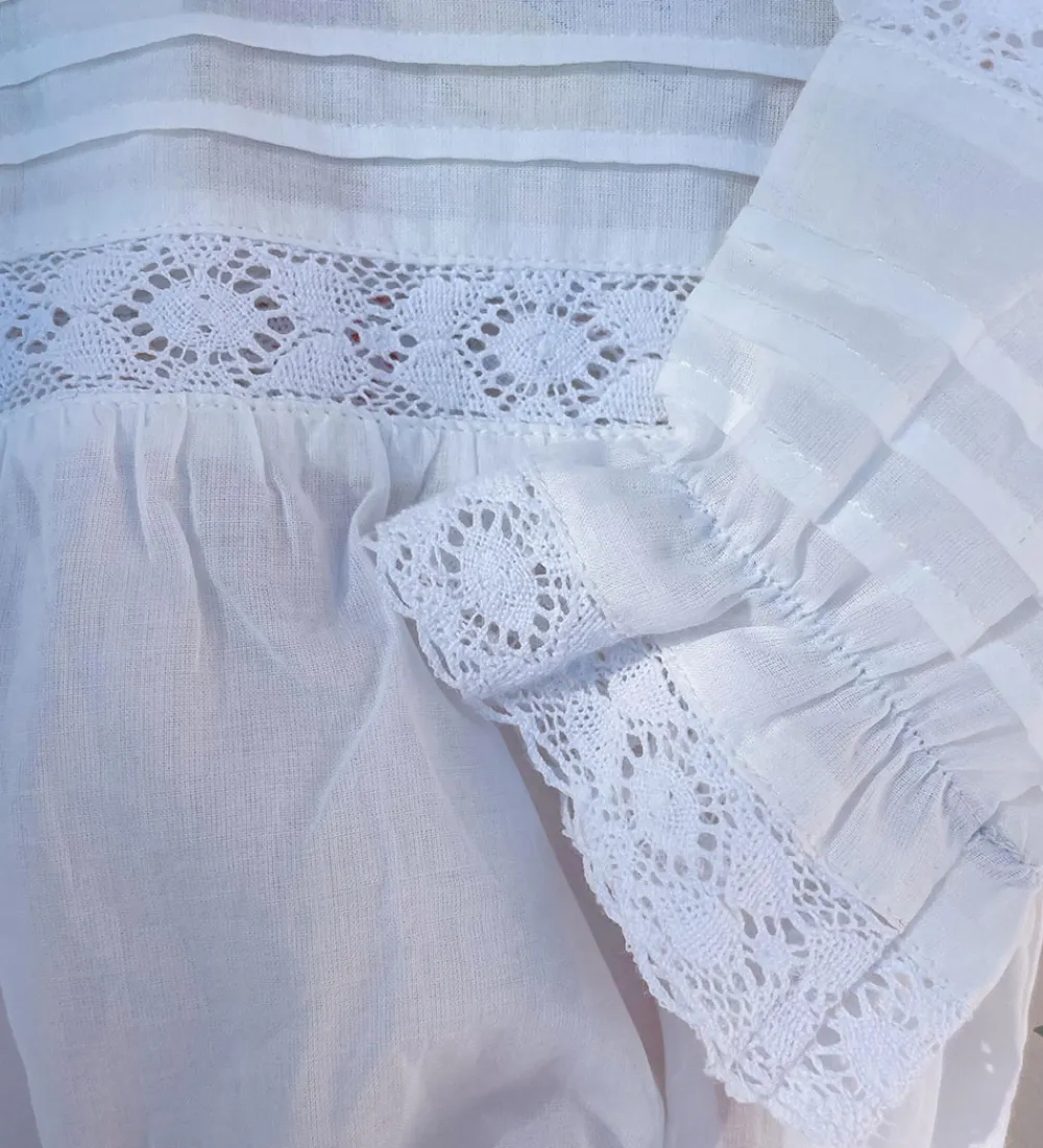 Sommerdragten har lange ærmer og et fint blonde- og hulmønster i stoffet. Sommerdragten har elastikkanter med blondekanter ved alle åbninger og den lukkes på ryggen med knapper.