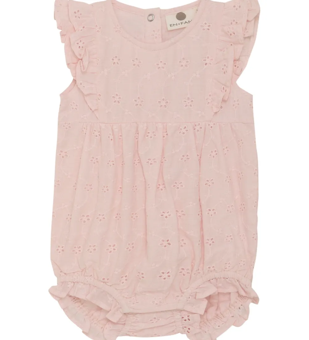 Fin sommerdragt fra En Fant i lys rosa med små, broderede blomster. Sommerdragten har en rund halsudskæring med trykknapper i nakken og er uden ærmer. Den har flæser ved skuldrene og i benåbningerne. Sommerdragten lukkes med trykknapper mellem benene.