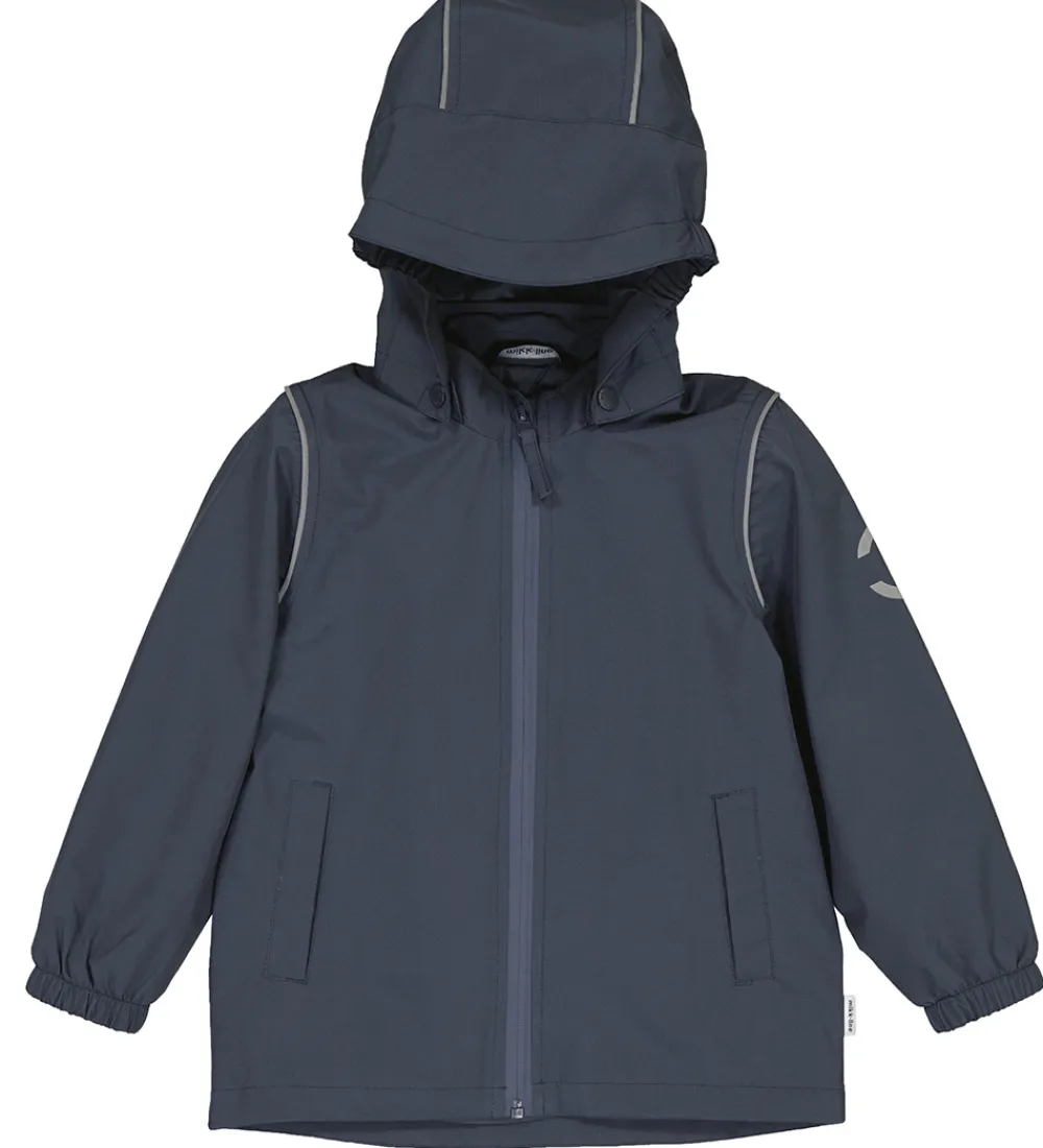 Mikk-Line sommerjakken har en aftagelig hætte, der sidder fast med trykknapper omkring den høje halskrave. Hættens ansigtsåbning er med elastikkanter og en lille skygge. Sommerjakkens lange ærmer har praktiske elastikkanter i åbningerne.
