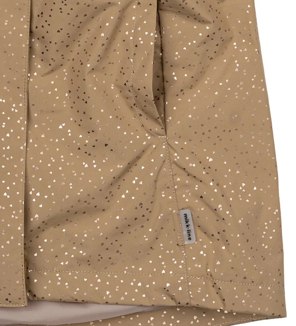 Fin Mikk-Line sommerjakke i en lysebrun nuance med et alloverprint af skinnende, gyldne hjerter.