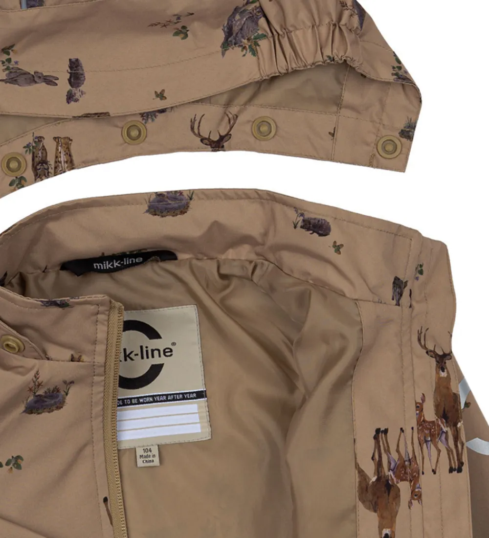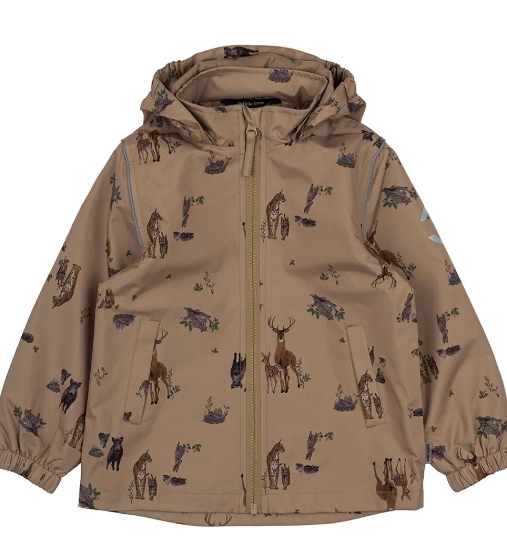 Dejlig Mikk-Line sommerjakke i brun med et alloverprint af skovens dyr.