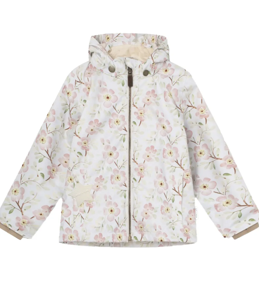 Smart Mini A Ture sommerjakke i hvid med et alloverblomsterprint i rosa, grønne, brune og gule nuancer. Sommerjakken har beige for.