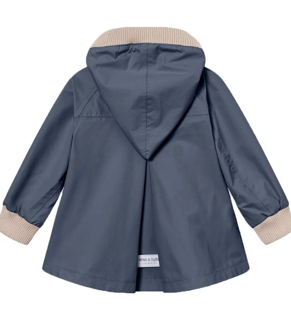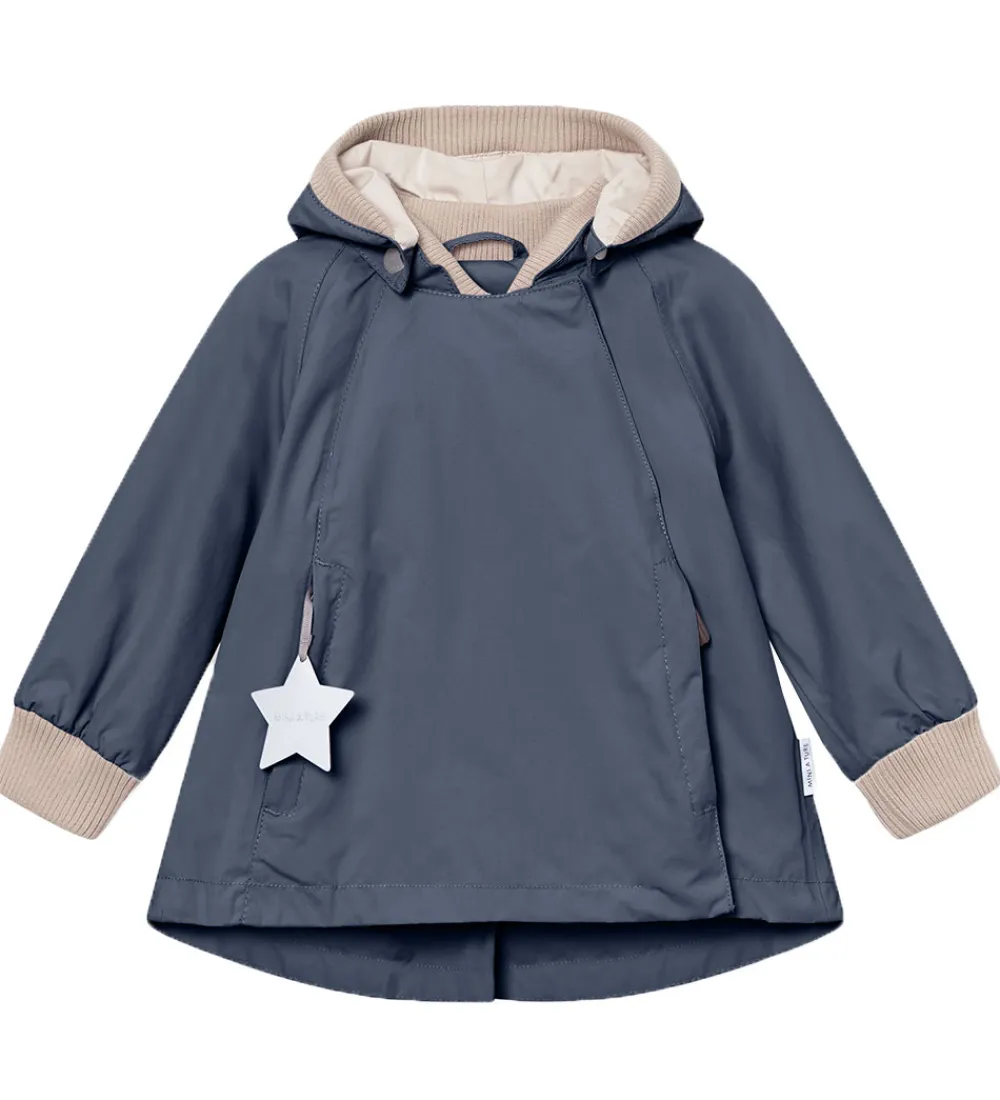 Mini A Ture sommerjakken har en aftagelig hætte, der fæstnes på ydersiden af kraven med trykknapper. Hætten har en spids form, og den har en blød ribkant i ansigtsåbningen. Ærmerne har brede ribkanter.