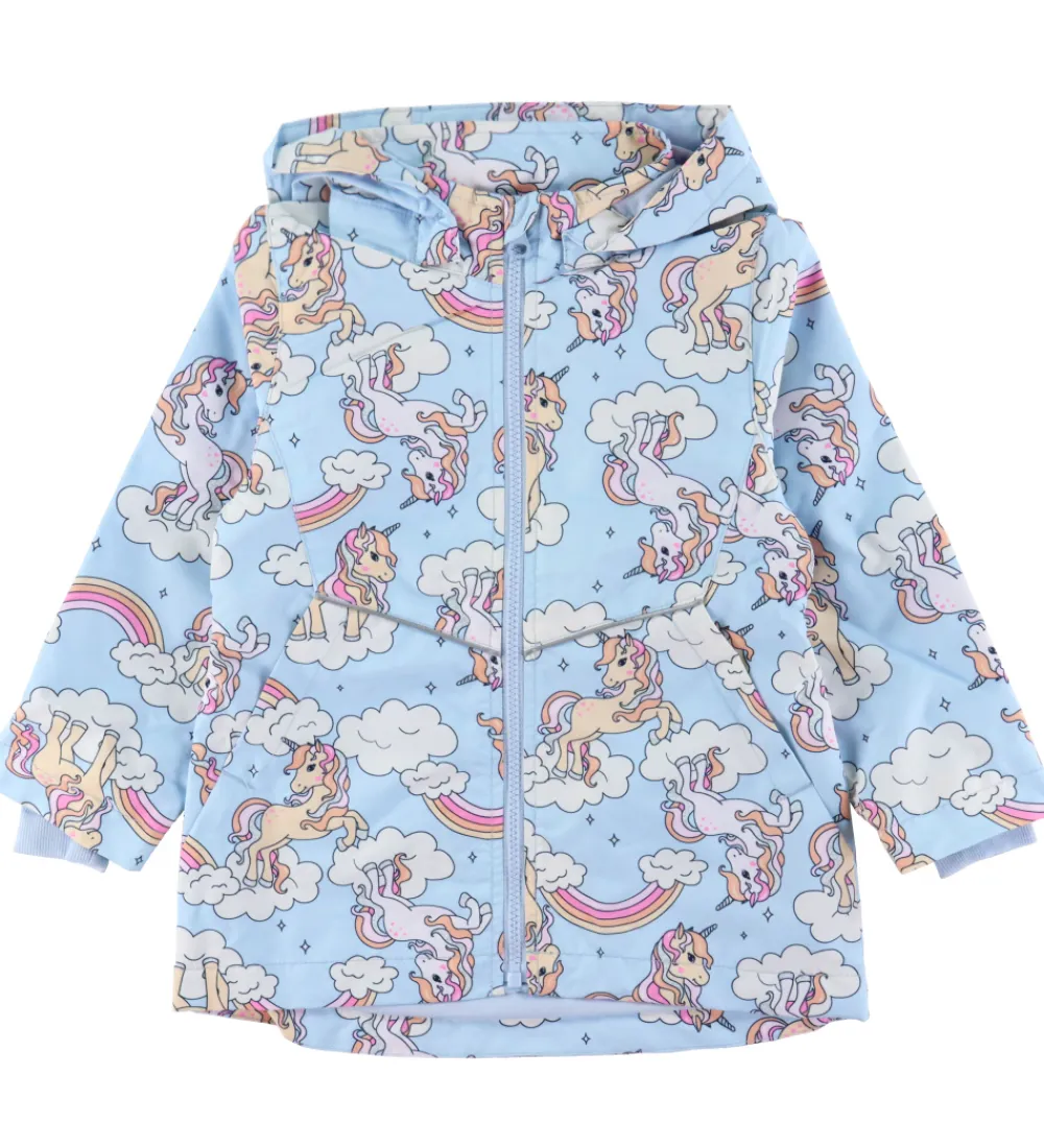 Skøn Name It sommerjakke i lyseblå med enhjørningeprint. På fronten er der reflekspipings, mens der på ryggen er en lille refleksapplikation nederst.