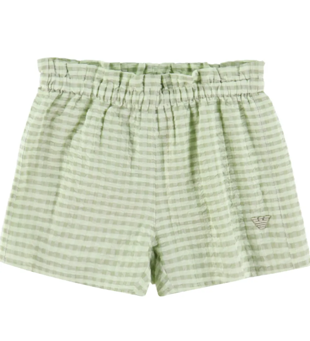 Sødt Emporio Armani sommersæt, der består af en top og et par shorts med et ternet mønster i rosa og hvid og med en crepestruktur. Sættet er lavet i en let, fastvævet bomuldskvalitet.
