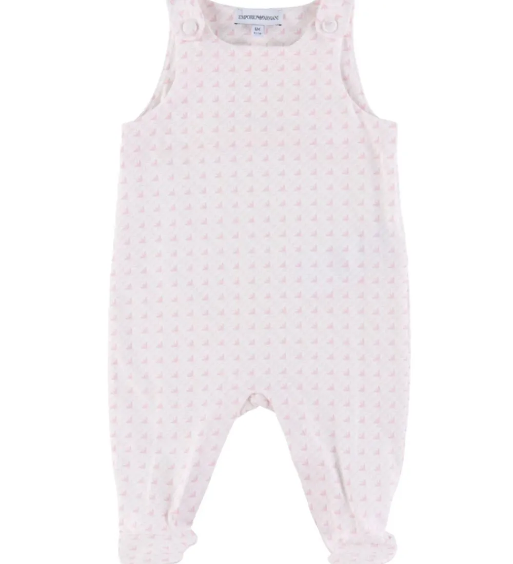 Sødt Emporio Armani sæt der består af en sparkedragt og en body. Sparkedragten er lys rosa med et alloverprint med logoer i en mørkere nuance, og bodyen er hvid, mens den på kraven har samme mønster som sparkedragten.