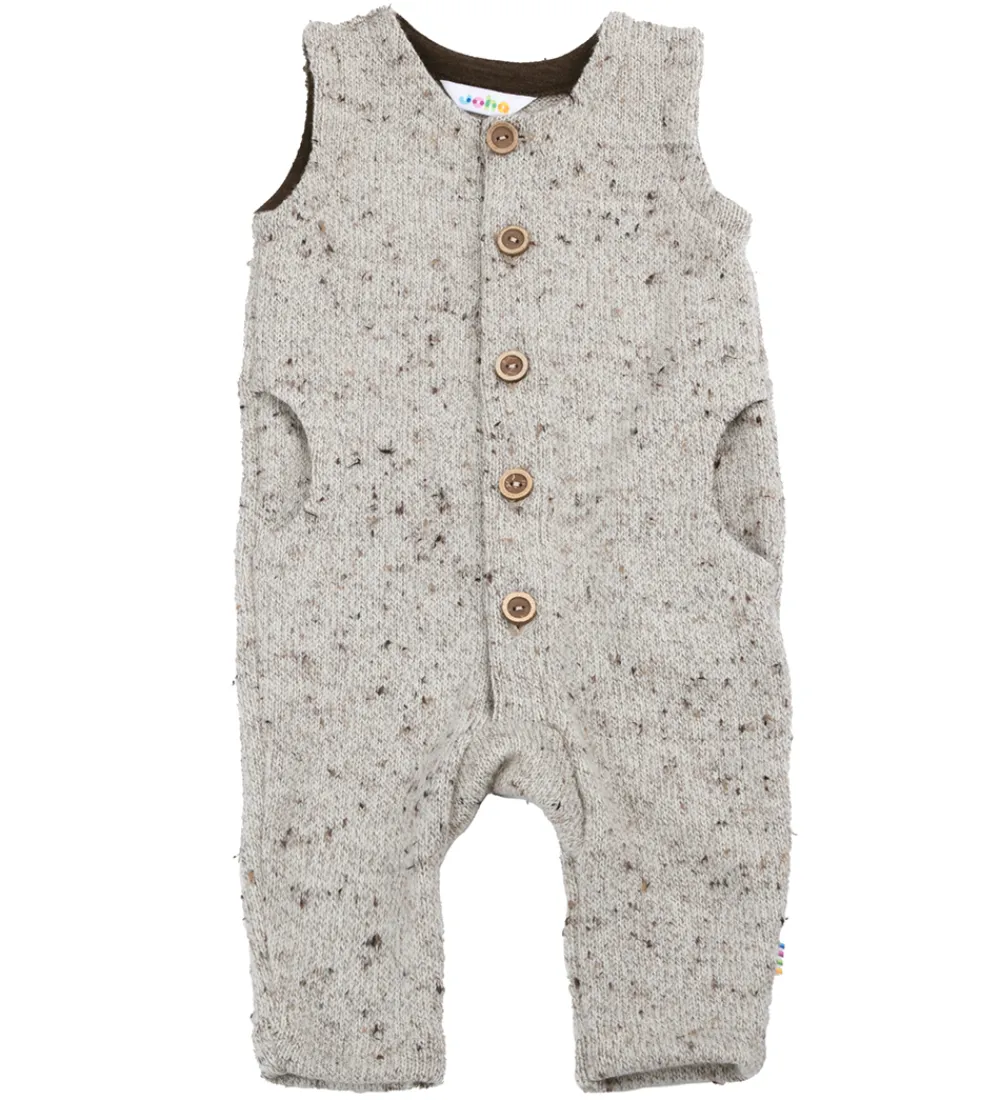 Joha sparkedragten har ingen ærmer og lange ben. Sparkedragten åbnes fortil ved hjælp af knapper af træ, og i siderne har den to forlommer i siderne med markante, runde åbninger. Sparkedragten er i en behagelig, blød uldskvalitet i strikstruktur.