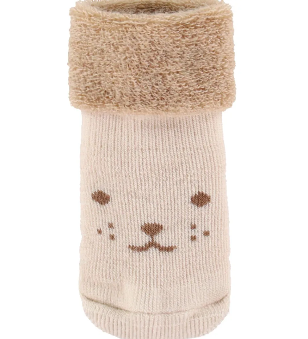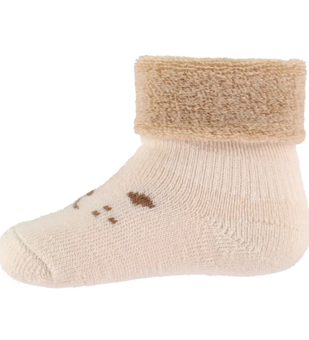 Bløde MP strømper i en lysebeige nuance med et sødt ansigt på foden. MP strømperne har et kort skaft med en bred opslået kant, der giver en god pasform omkring anklen.