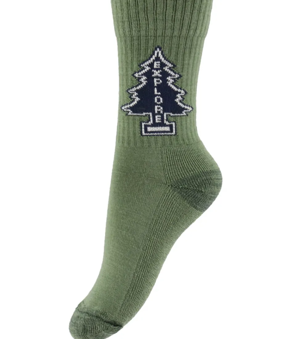 Stilfulde MP strømper i en flot, grøn nuance med et print af et juletræ og teksten “Explore” i mørke farver. MP strømperne har et langt skaft med en bred ribkant øverst, der sikrer en god pasform. Detaljerne i mønsteret tilføjer et unikt element til strømperne.