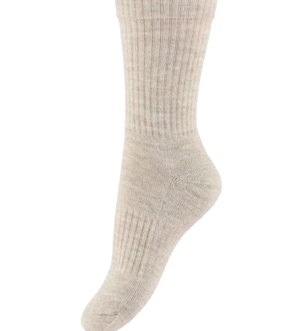 Behagelige MP strømper i en meleret, lysebeige nuance. MP strømperne har et langt skaft med en fin ribstruktur og en smal elastikkant øverst, der sikrer en god pasform. Passer til hverdagens krævende situationer med stilren enkelhed.